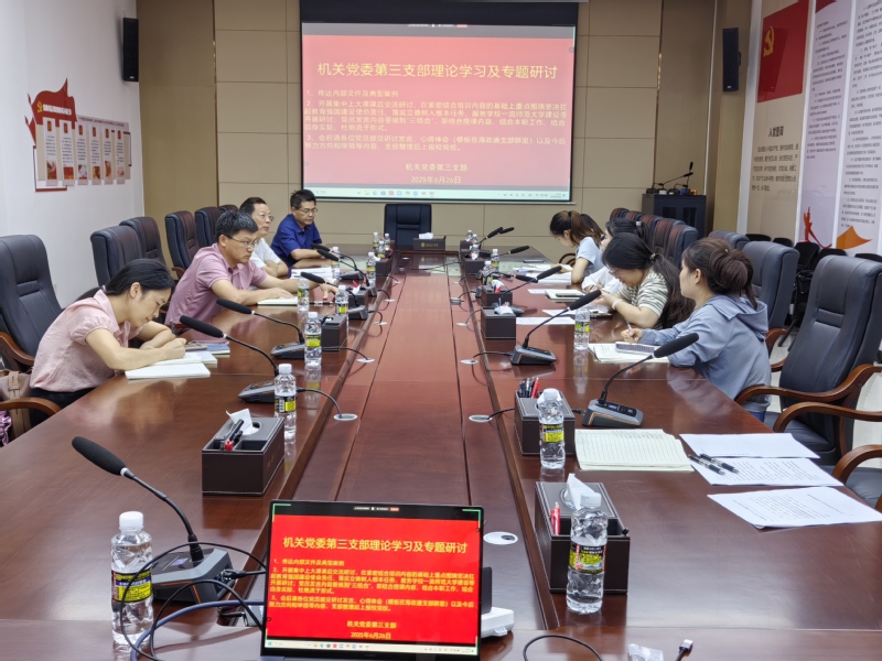 6月26日下午,机关党委第三党支部在桂林洋校区第一公共教学楼一楼党建活动室召开理论学习会议,支部全体成员参加会议。