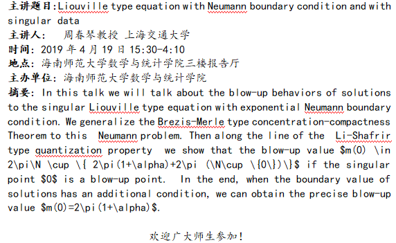 专家学术讲座公告——Liouville type equation with Neumann boundary condition and