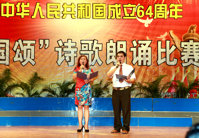 学校于9月27日晚8点在田家炳二楼报告厅举办了“祖国啊,我们爱您!——我校举办教职工庆祝新中国成立六十四周年祖国颂诗歌朗诵比赛”,我院唐若玲、潘桂林老师
