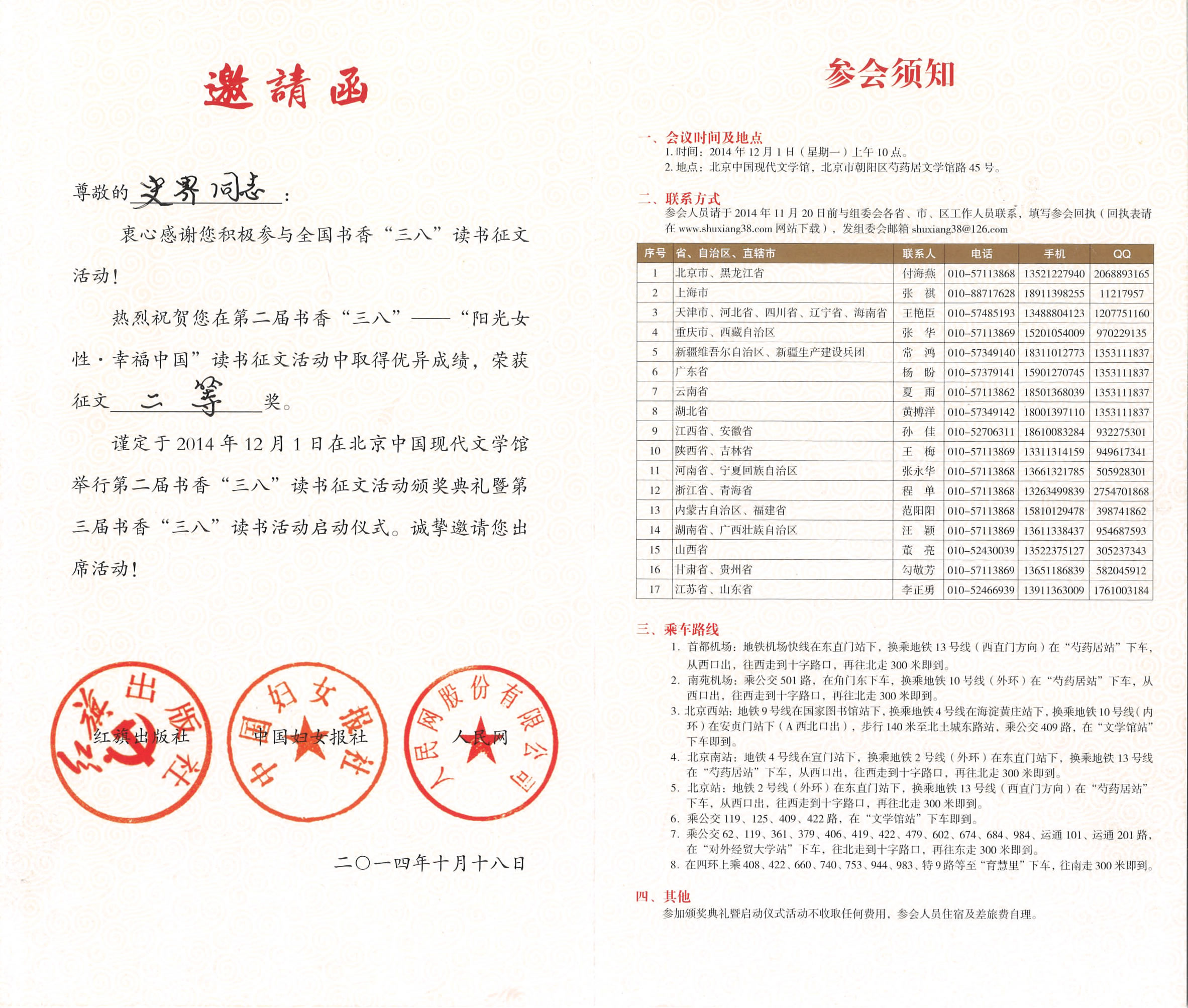 我院史界老师参加2014年“三八”节“阳光女性-幸福中国”读书征文比赛荣获省一等奖、国家二等奖