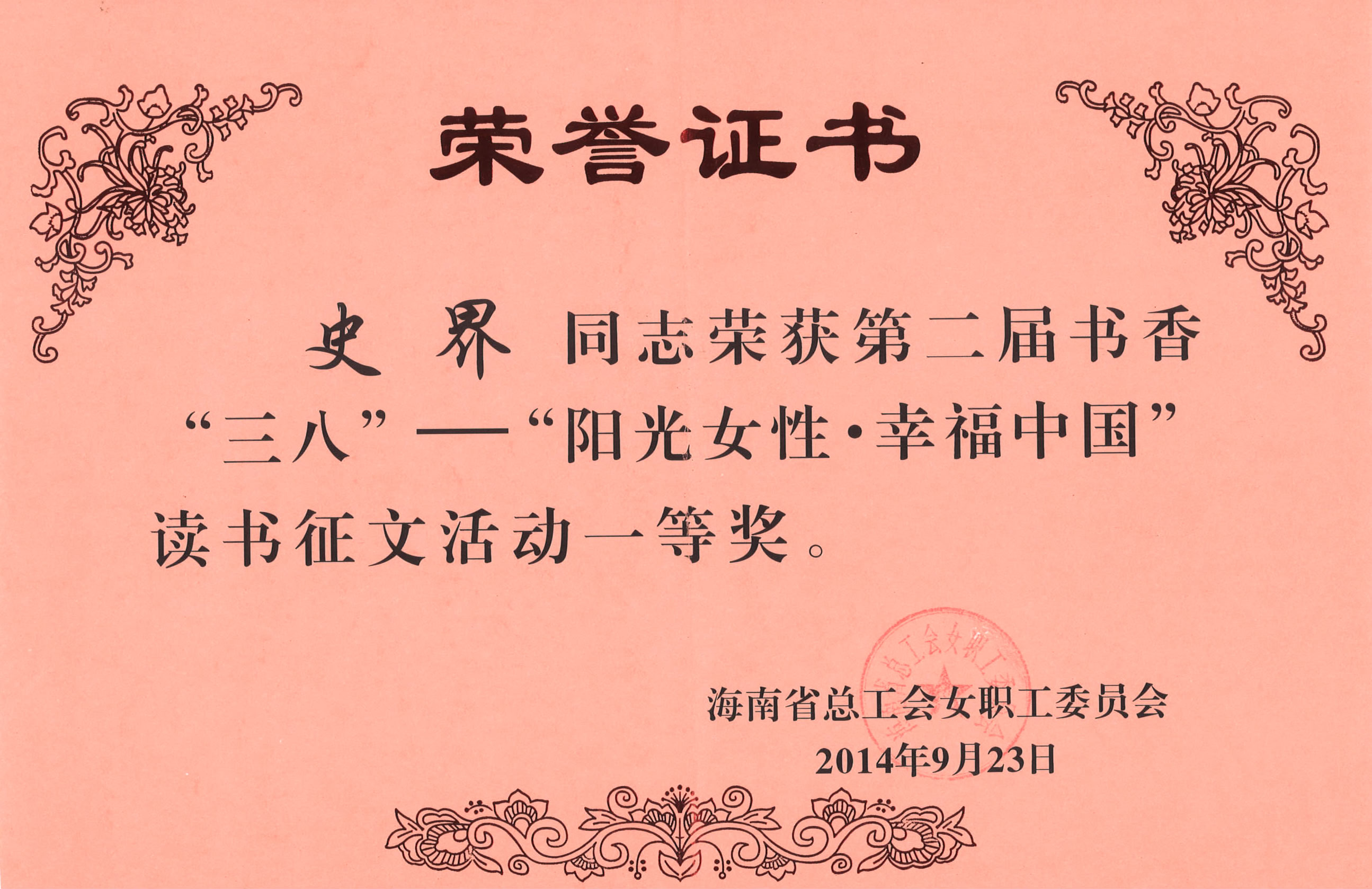 2014年,我校教育工会牵头组织参加海南省总工会举办的“三八”节--“阳光女性·幸福中国”读书征文比赛中,史界老师以《用心hold住幸福》一文荣获一等奖,同时,还获得全国书香“三八”节--“阳光女性·幸福中国”读书征文比赛二等奖。