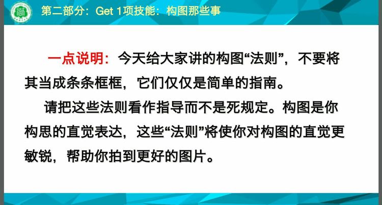陈老师围绕“区分拍照和摄像、get构图技能、交流拍照心得、赠送‘虚拟礼包’”四大部分展开本次培训会,为同学们教授丰富的拍照技巧,清晰生动的ppt使大家眼前一亮。