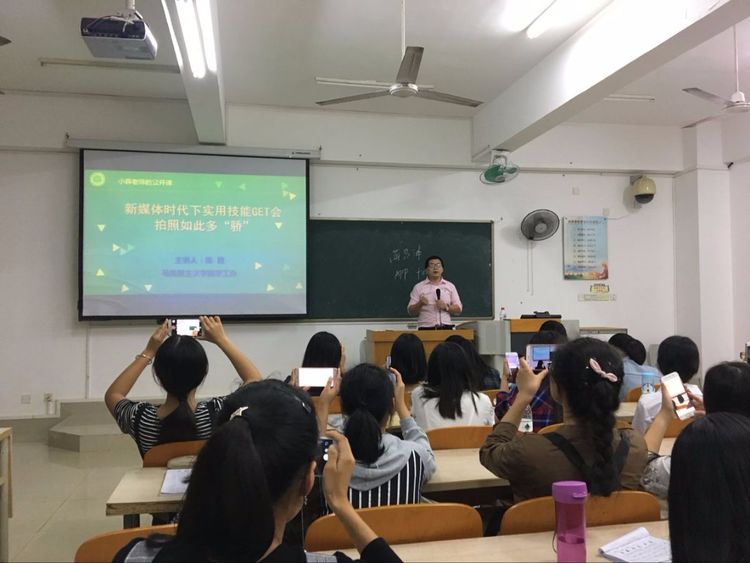11月9日晚,在皎皎月光,徐徐晚风下,马克思主义学院辅导员陈霆老师在海南师范大学桂林洋校区公共楼602教室如期为学生讲授新媒体时代下实用技能GET会。本次培训会响应我校“创新创业实践周”的号召,旨在帮助大学生获得新媒体时代下的基本技能之拍照技巧,使大学生更好适应时代创业大潮。我院共有95名本科生参加本次培训会。