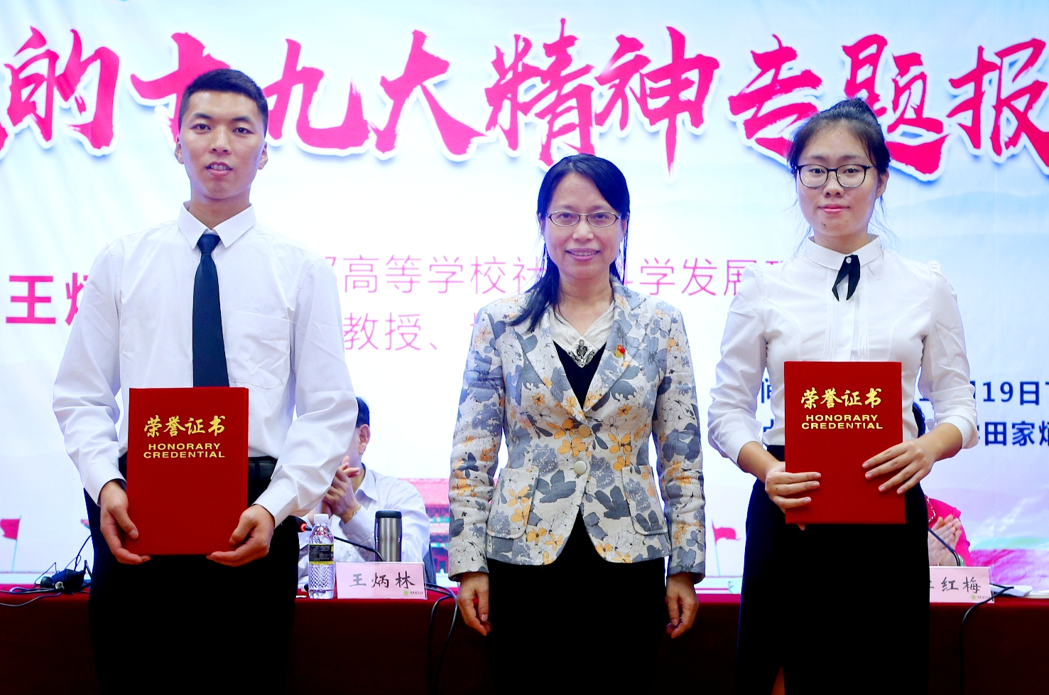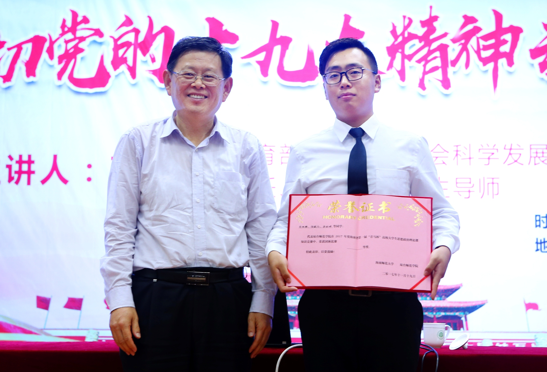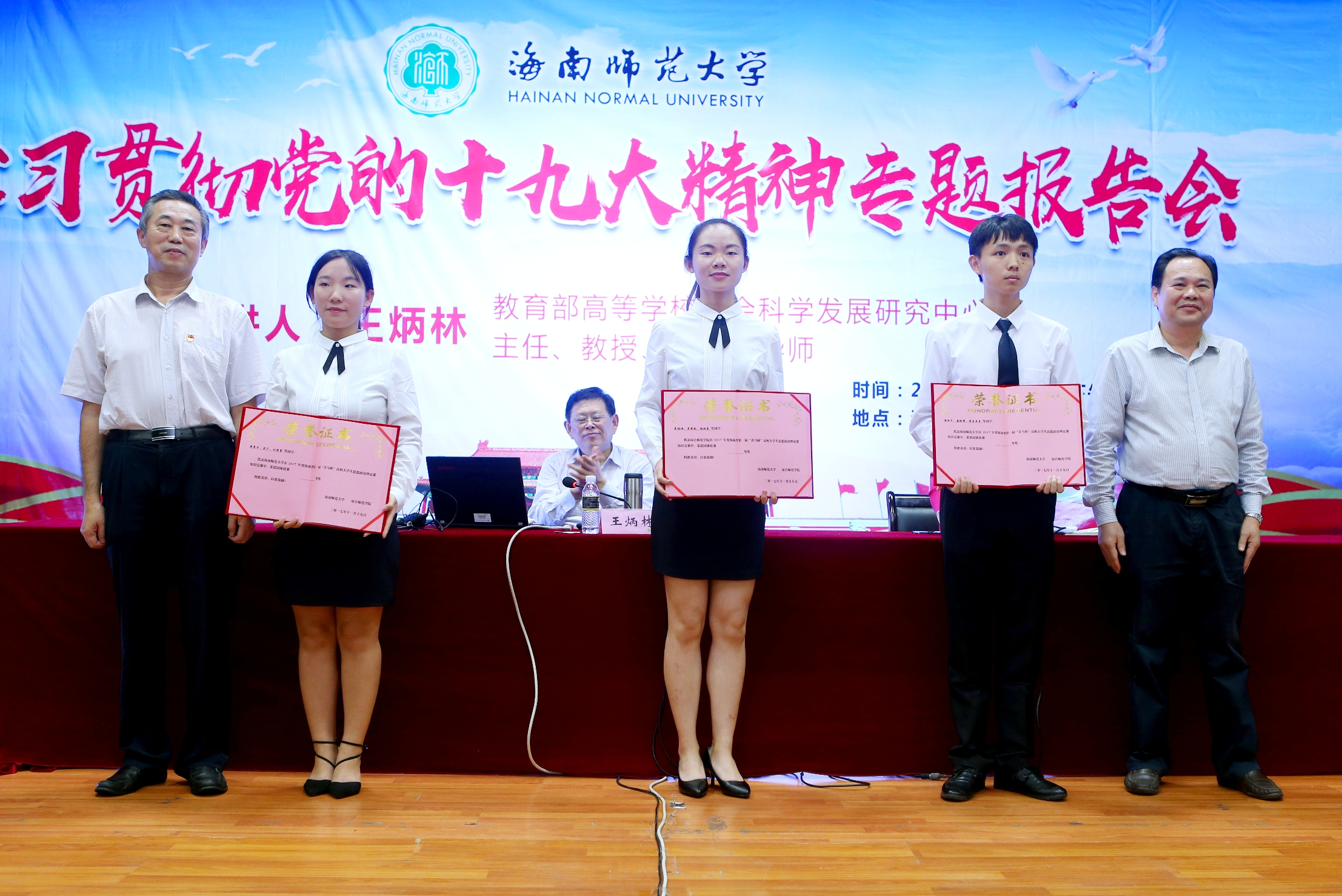 本次竞赛得到了学校党委李红梅书记的直接指导和教育厅思政处、校相关部门的大力支持。教育部高校社会科学发展研究中心主任王炳林、我校党委副书记刁晓平及副校长史海涛、琼台师范学院副校长何进威为获奖团队代表颁奖。