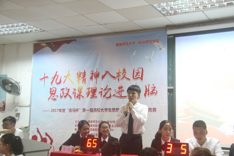 为了将党的十九大精神及成果转化为实际行动,让大学生更加深入地了解所肩负的历史使命和社会责任,进一步增强学习宣传贯彻习近平新时代中国特色社会主义思想的主动性,11月19日,海南师范大学和琼台师范学院联合举办了海南省第一届“青马杯”高校大学生思想政治理论课知识竞赛。