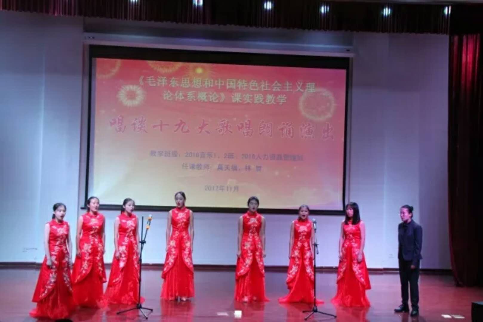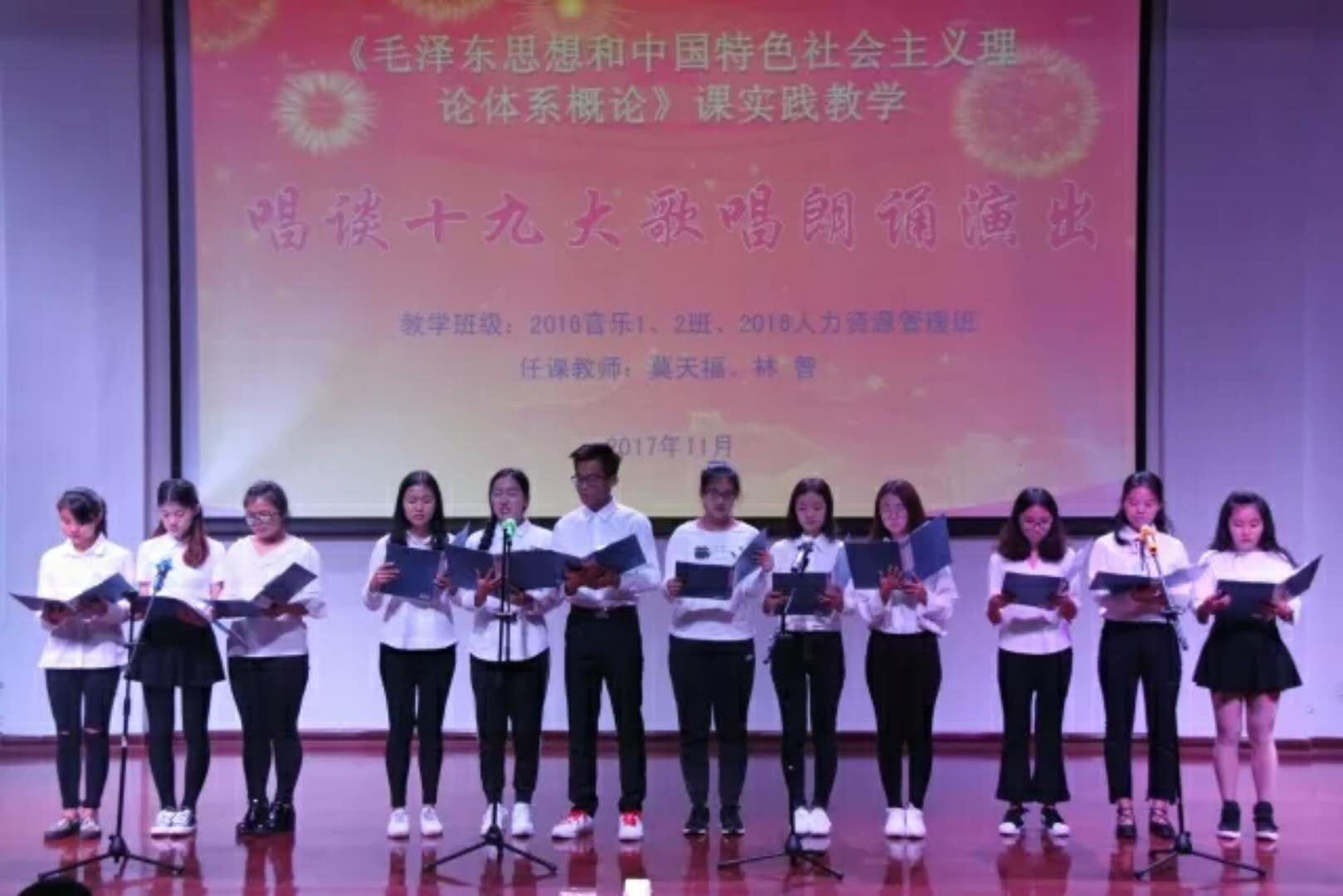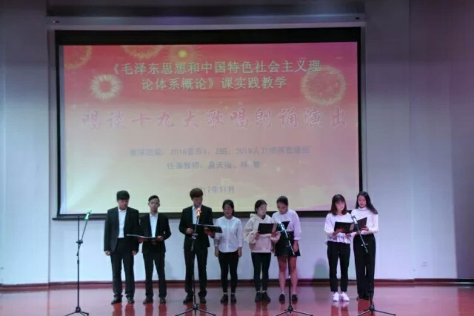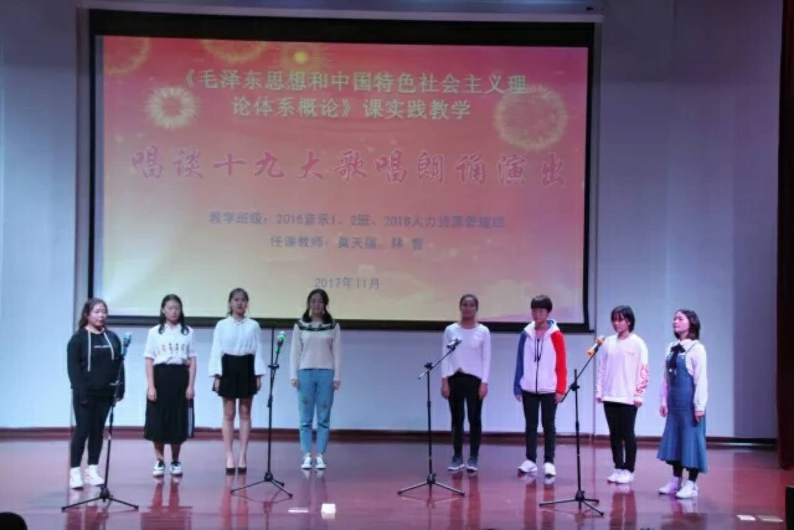 为了深入学习宣传十九大精神,将十九大精神带进课堂、带进教材、带进头脑,《毛泽东思想和中国特色社会主义理论体系概论》教研室组织2016级音乐1、2班和2016人力资源管理班两个教学班举办了“唱谈十九大”歌唱朗诵演出实践教学活动。