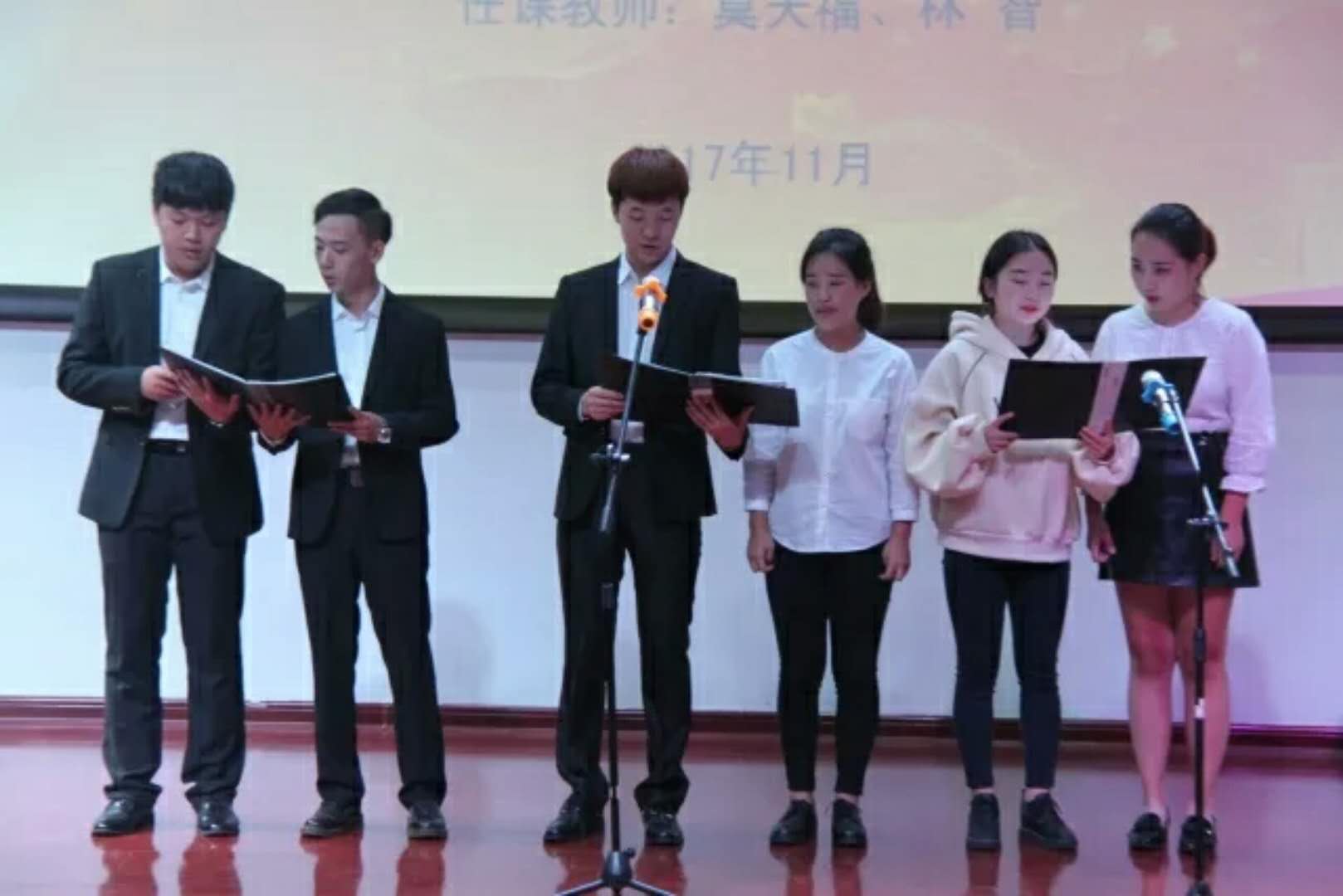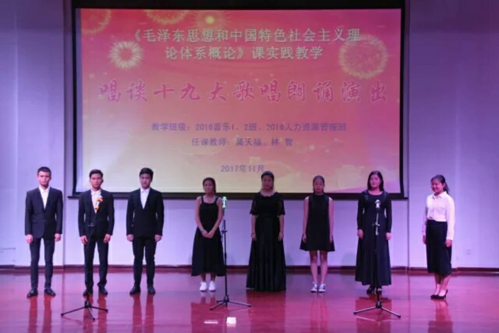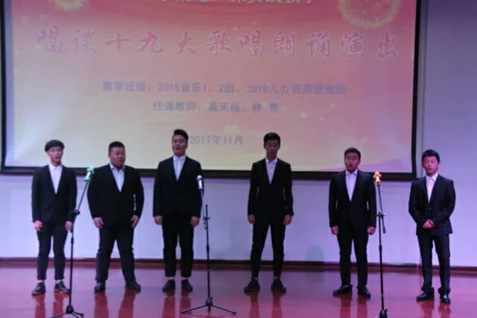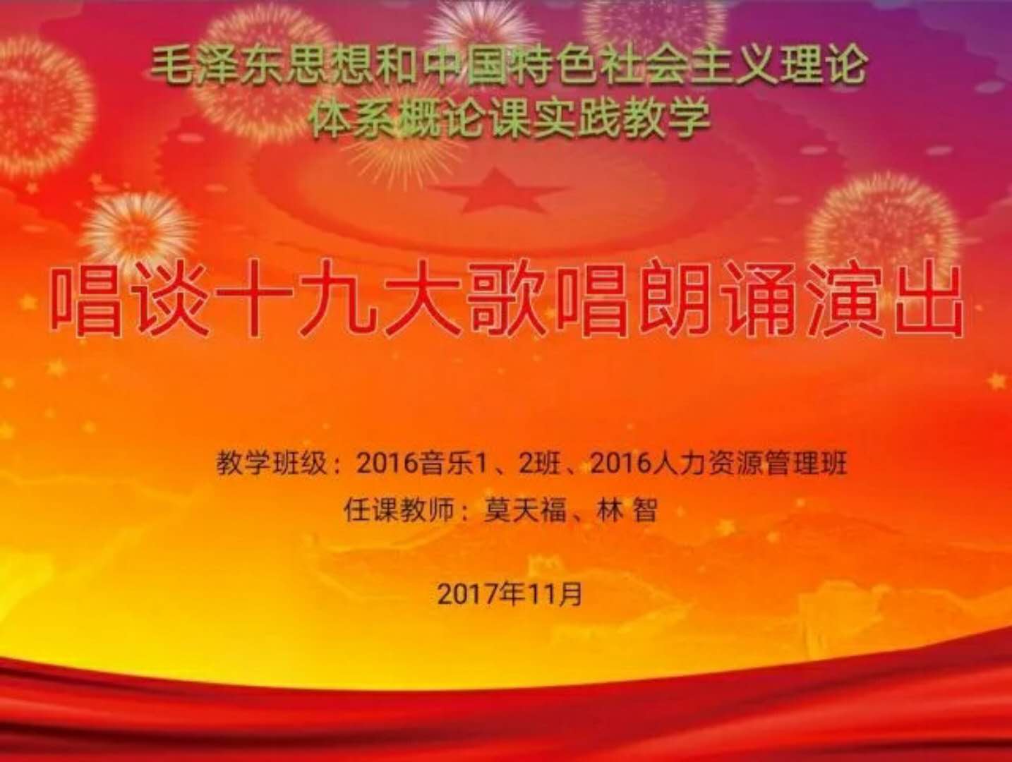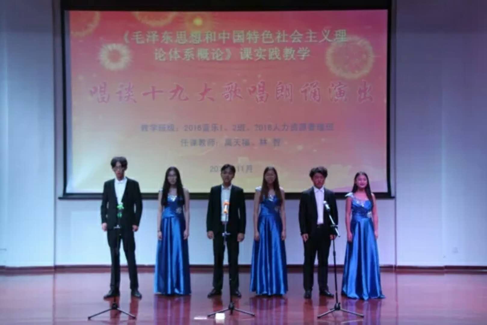 为了深入学习宣传十九大精神,将十九大精神带进课堂、带进教材、带进头脑,《毛泽东思想和中国特色社会主义理论体系概论》教研室组织2016级音乐1、2班和2016人力资源管理班两个教学班举办了“唱谈十九大”歌唱朗诵演出实践教学活动。