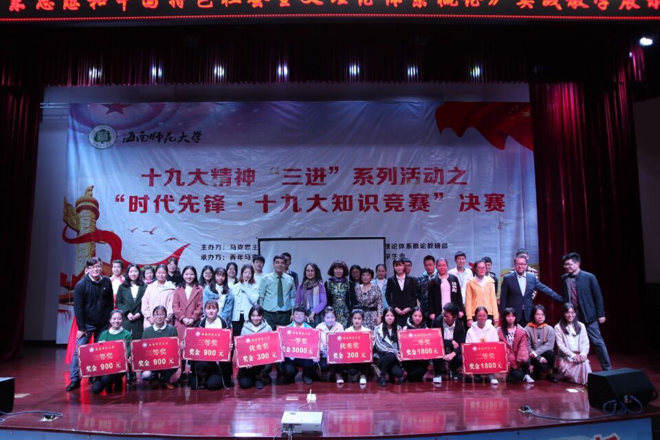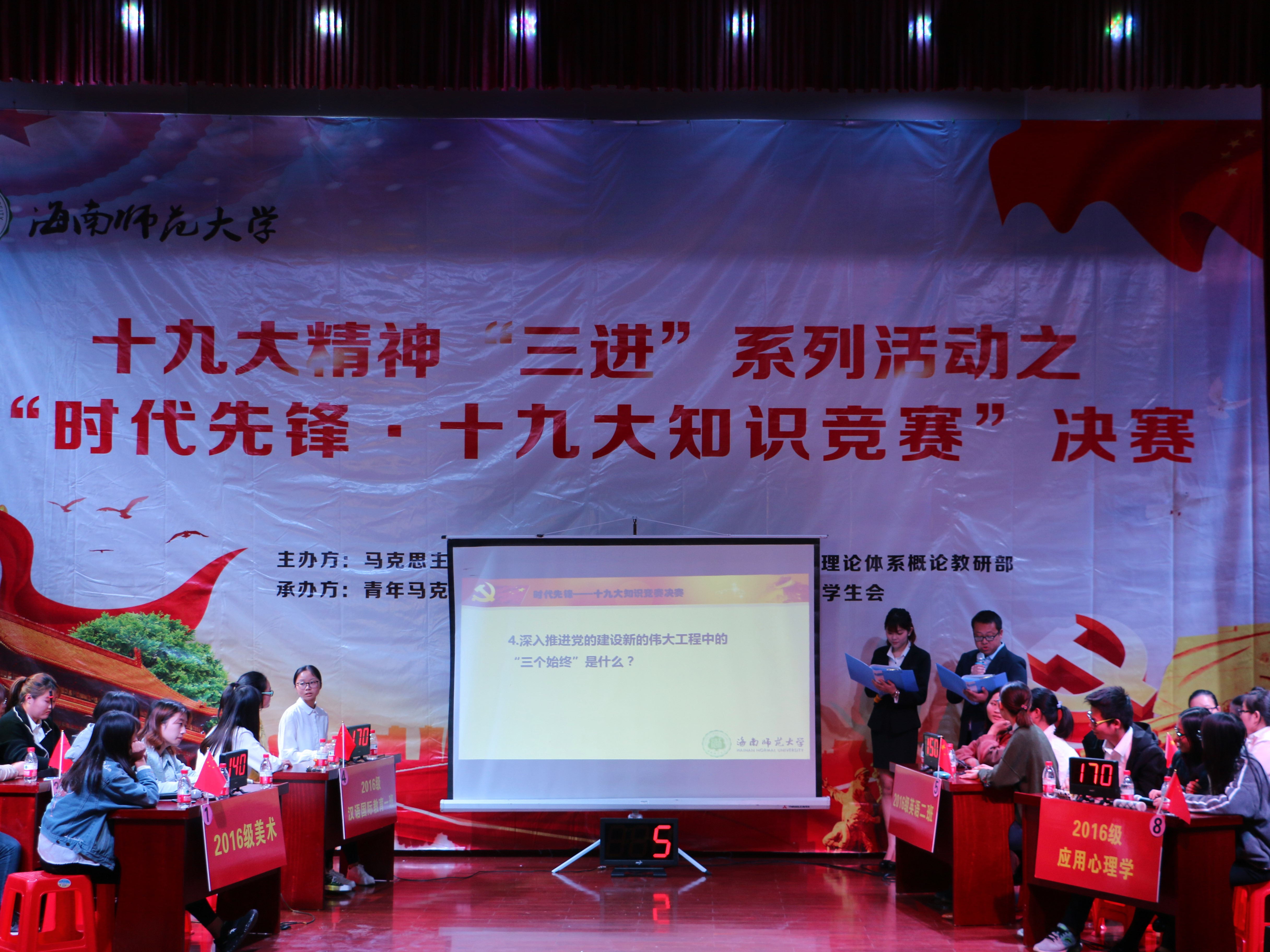 为了更好地学习和贯彻十九大精神,马克思主义学院“毛泽东思想和中国特色社会主义理论体系概论教研部”开展了一系列十九大精神“三进”活动。其中,“时代先锋·十九大知识竞赛”初赛、复赛分别于第十一周、十三周在61个教学班级展开。12月19日下午三点,决赛在曾宪云报告厅举行。