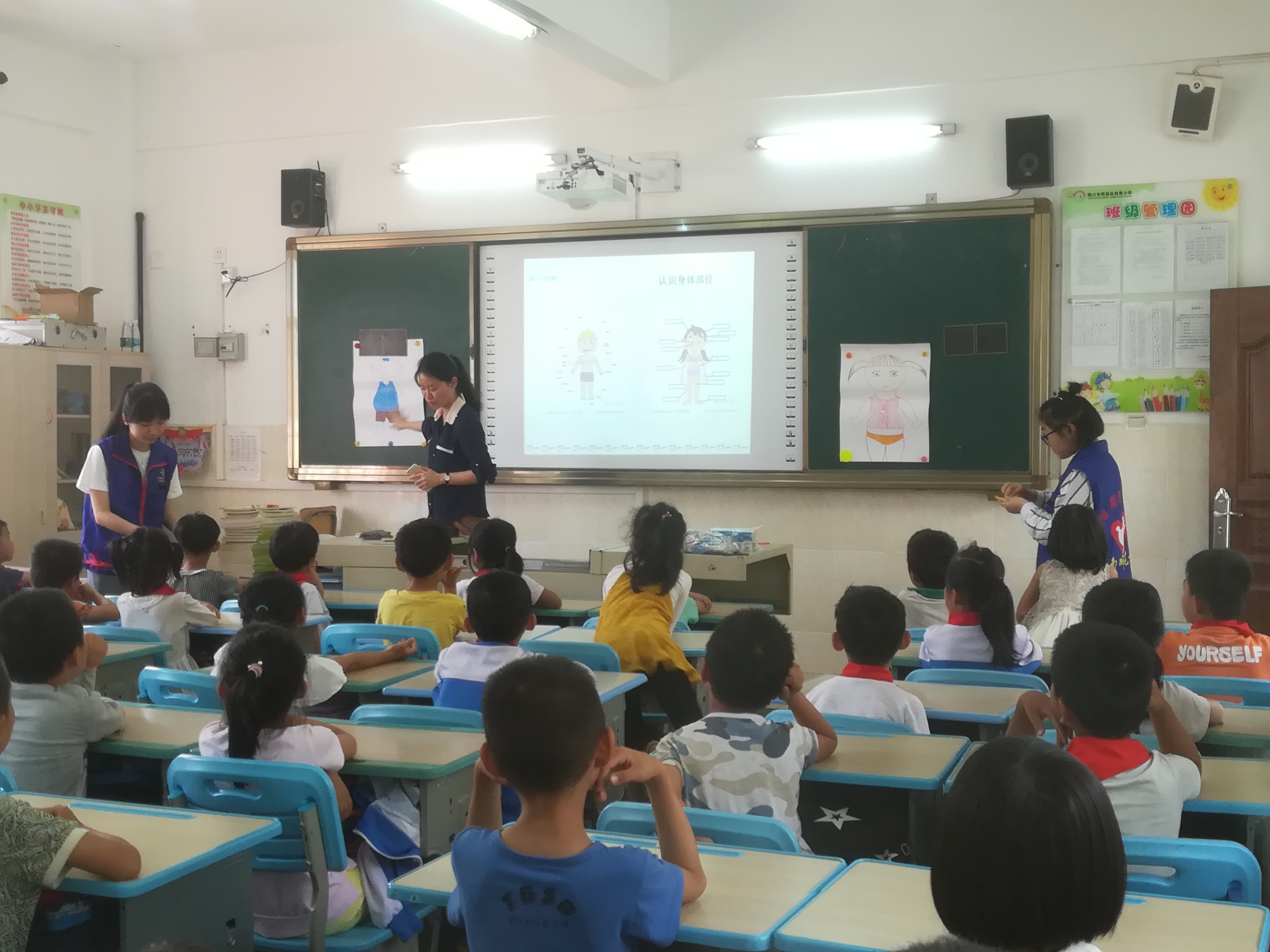 在心理辅导课堂上,老师带领学生们认识自己的身体。由志愿者们给每一个小朋友分发便利贴,让他们到讲台上,在老师提前准备好的男生、女生身体轮廓图上标记别人不能碰的身体部位,小朋友们标记得很认真。志愿者在课堂最后给每一个小朋友们分发小奖品予以鼓励,希望他们能记住在这堂课上学到的知识,在生活中学会正确保护自己。