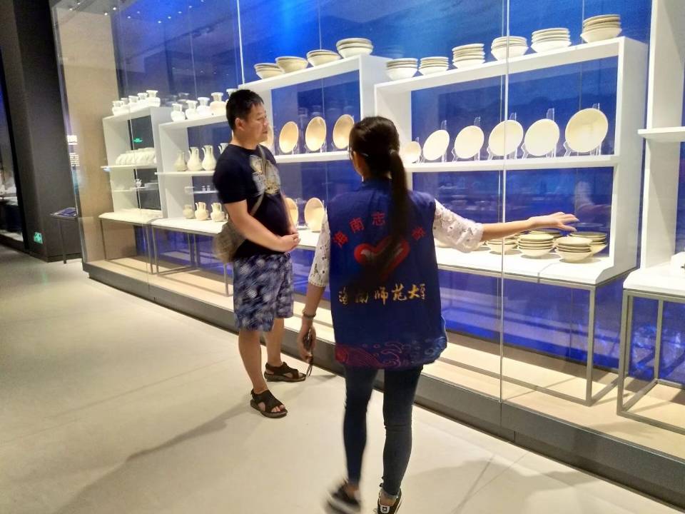 在博物馆门口集合签到完毕后,志愿者按照之前分配好的任务来到自己所负责的岗位上开始工作。在博物馆门口的自助取票机处,志愿者顶着烈日,迎着热浪为前来参观的游客取票,认真的脸上即使早已挂满了汗珠,但手里的动作却没有因此而间断;远处志愿者服务站旁,志愿者们蓝色的身影已然成为一道靓丽的风景线,他们为游客提供展厅咨询,有时亲自引导游客到达展厅,偌大的布局和结构在他们的心里仿佛再熟悉不过了;展厅负责讲解的志愿者们由于第一次工作,对于各种文物的繁多的讲解词还很生疏,一遍、两遍、三遍……从不熟悉到渐渐地得心应手,他们坚持在自己的岗位上,为前来参观的游客耐心地讲解着。