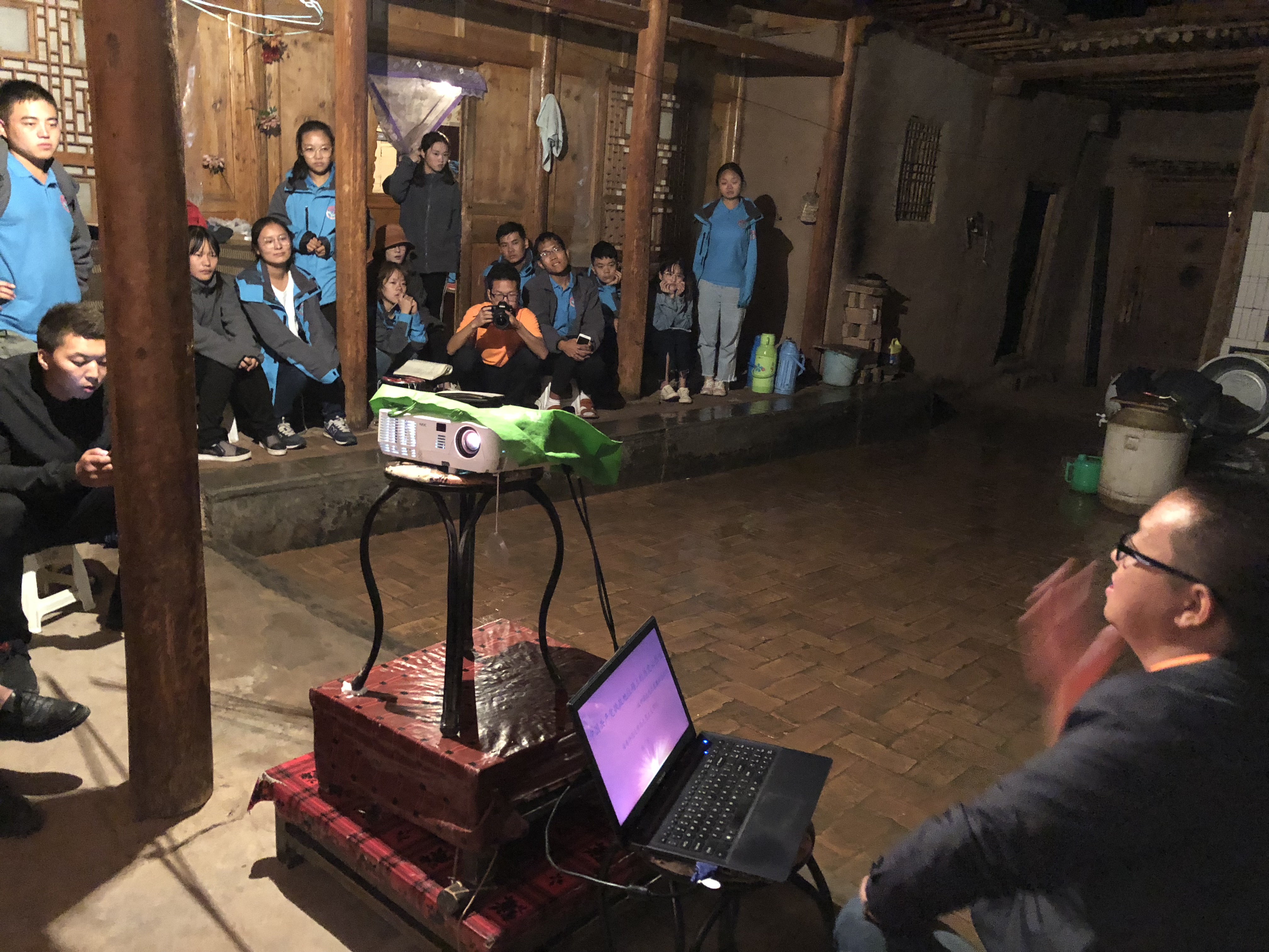 8月2日晚,天降大雨,但这丝毫没有影响到志愿者听讲座的热情。或许,这样的环境,更能让志愿者体会到中国共产党为了人民群众的福祉而浴血奋斗的艰辛。一个志愿者用伞给投影仪遮住雨,其他志愿者围着屋檐静静地看着“大屏幕”。目光的另一端,是向广宇老师从中国近现代发展路径出发,倾情讲述中国共产党执政地位确立的历史必然性。向老师从中国近现代的发展历程,结合他在井冈山的学习经验,向我们阐释了中国共产党从萌芽到发展壮大的艰苦历程,引导志愿者树立高度的民族自尊心和自信心,让志愿者深切体会到自己肩负着国家和民族的历史重任。此情,是志愿者“入脑”“入心”的国家情;此景,是志愿者冒雨学习党史知识的科巴景。