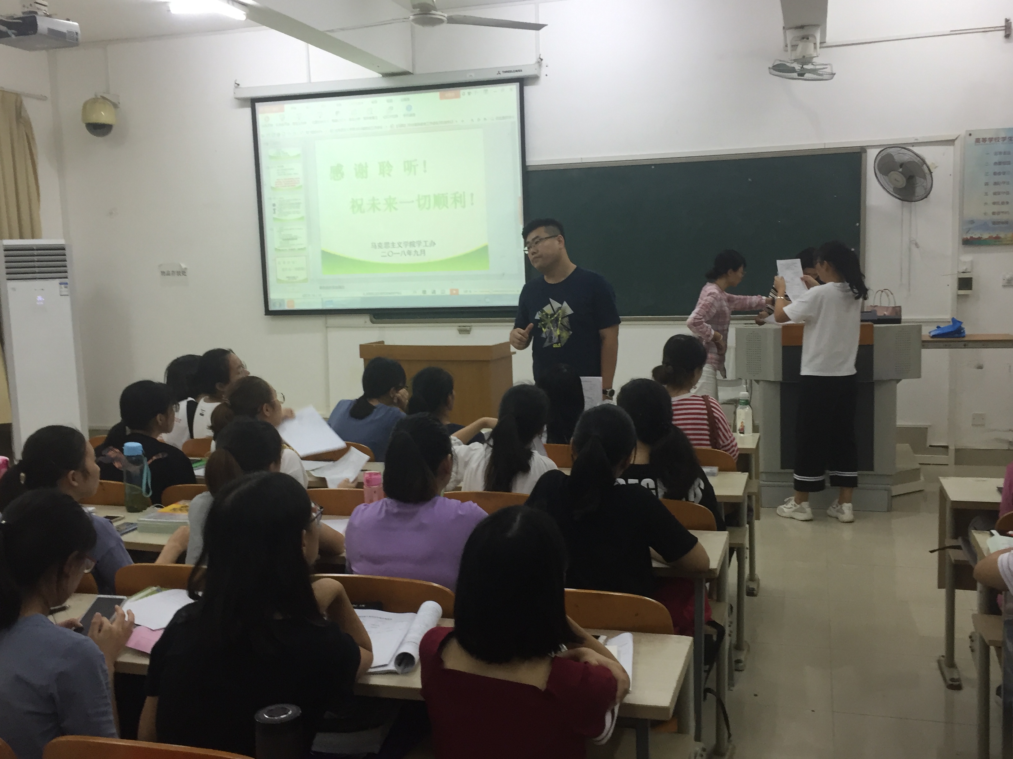 随后,刘英博老师继续就毕业生离校前的工作进行了大致介绍。英博老师从整体上强调了顶岗支教和集体实习的安排以及注意事项,并针对下学期的毕业论文答辩以及毕业生晚会做了进一步的阐释,最后提醒大家要保管好相关的材料和注重提高自身技能。