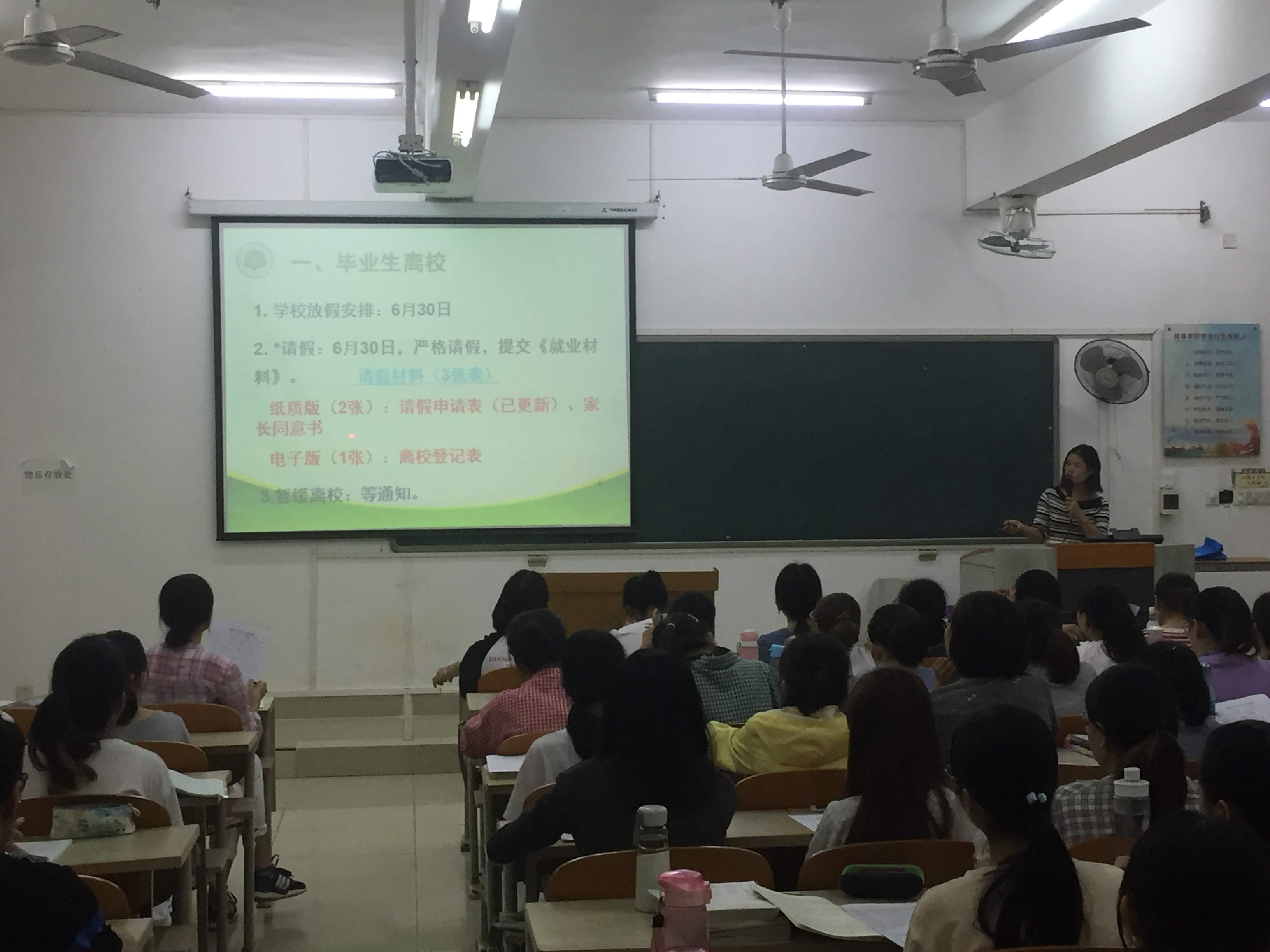 随后,刘英博老师继续就毕业生离校前的工作进行了大致介绍。英博老师从整体上强调了顶岗支教和集体实习的安排以及注意事项,并针对下学期的毕业论文答辩以及毕业生晚会做了进一步的阐释,最后提醒大家要保管好相关的材料和注重提高自身技能。