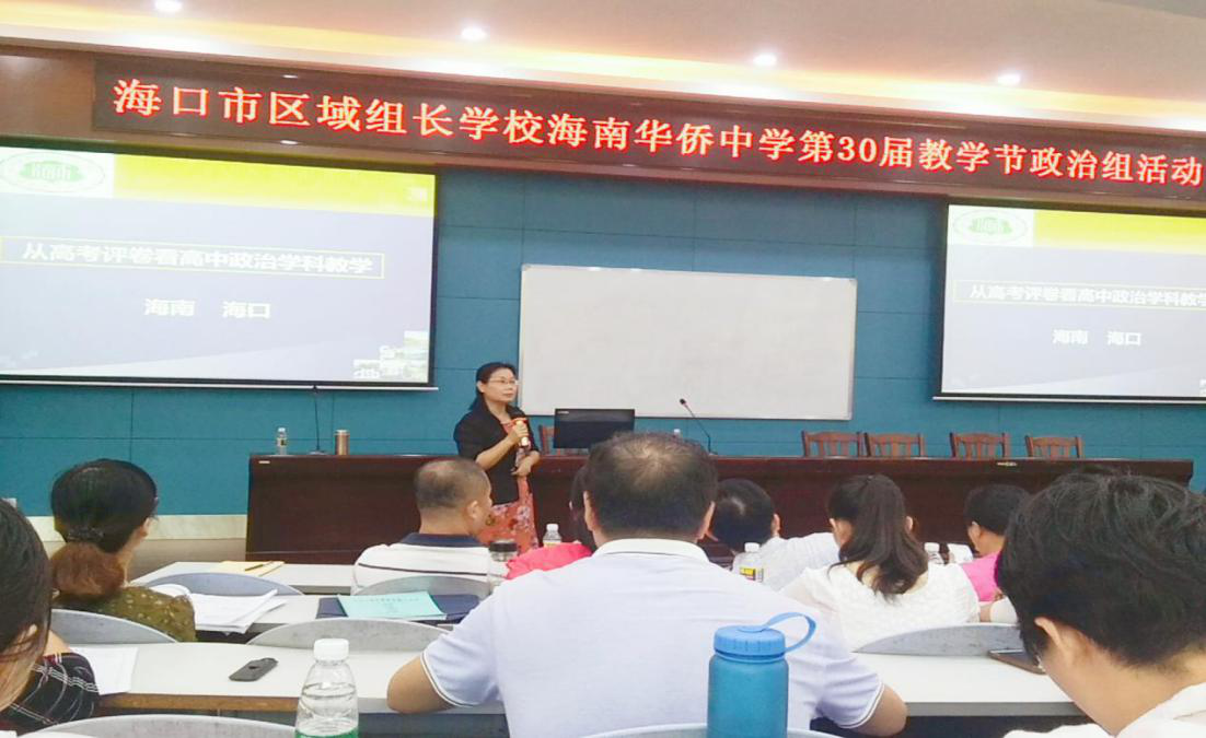 本次活动共分两个环节。第一环节,由海南华侨中学翟小强、琼山中学王婉雪老师展示教研成果——关于“坚持新发展理念”等教学内容的同课异构,华侨中学、琼山中学政治组负责人及我院专硕校外导师张德明老师进行了精彩点评。第二环节,由我院陈连珠老师主讲“从高考评卷看高中政治教学”的专题讲座。