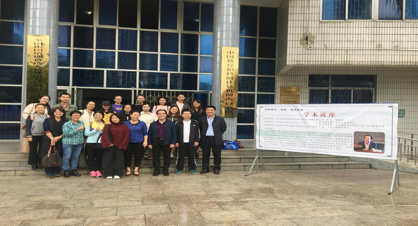 2018年12月8日上午,《中学政治教学参考》黄建炜主编应邀在我校实验楼1003教室作了题为“《中学政治教学参考》2018-2019年度选题策划”的专题讲座。马克思主义学院部分教师,2017、2018级学科教学(思政)专业硕士约20人聆听讲座。
