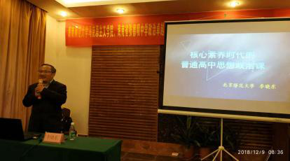 会议分专题报告和研讨交流两个环节。国家高中思想政治课程标准修订组核心成员、思想政治课教学学术委员会常务副主任兼秘书长、北京师范大学学科教学论(思想政治)学科带头人李晓东教授作题为“核心素养时代的普通高中思想政治课”的专题报告;全国中文核心期刊《中学政治教学参考》黄建炜主编作题为“漫谈政治教师教研论文撰写规范与投稿技巧”的专题报告。文昌政治教研员陈文成、北师大万宁附中王帆、澄迈思源高中辜芍文等老师作主题发言。与会老师围绕学科教学(思政)专业硕士培养、高中政治教学改革、教学研究与论文写作等问题进行了热烈而富有成效的研讨交流。会议取得圆满成功。
