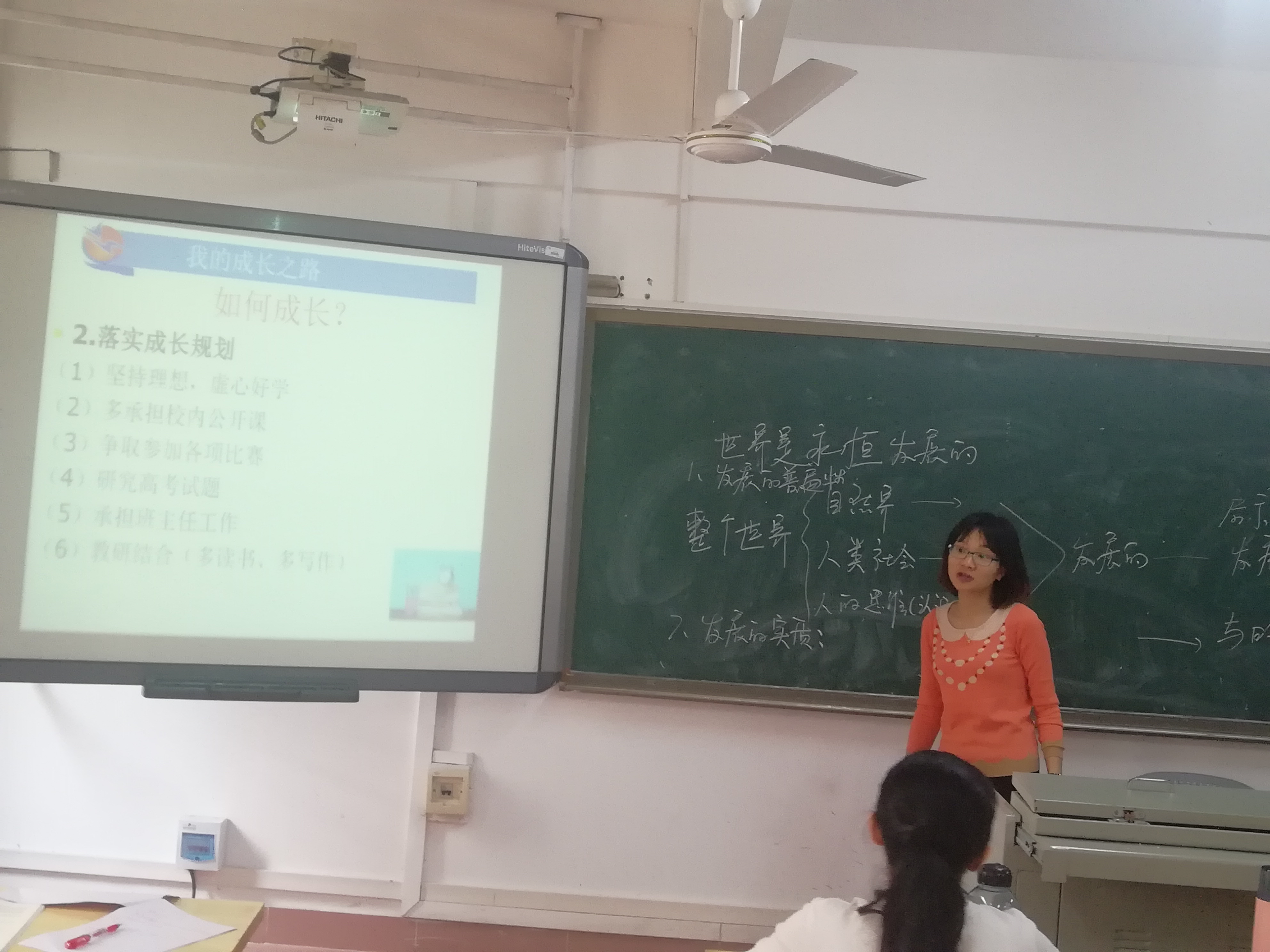 高老师示范课的内容是《生活与哲学》第八课第一框“发展的普遍性”。在导入环节,高老师通过西城高铁的案例,让同学们感受到蜀道难的情况已经不存在,科技给人们的生活带来了巨大发展。课堂总共有三个活动探究。活动一是让同学们就自然界、人类社会、人的认识世界发展的例子进行发言,证明发展是普遍的。并且每个小节都用古诗词进行总结,使同学们加深了对知识的理解,环节之间过渡也非常自然。活动二是“赏中华诗词,寻哲学意境”诗词PK赛。高老师用诗词比赛大会这个活动来讲授运动、变化、发展的关系以及发展的实质,总结出我们要增强创新意识,促进新事物的产生。活动三是提问同学海口的变化。在问答过程中培养学生的政治认同感。最后,通过展示中国高铁事业的发展总结课堂。