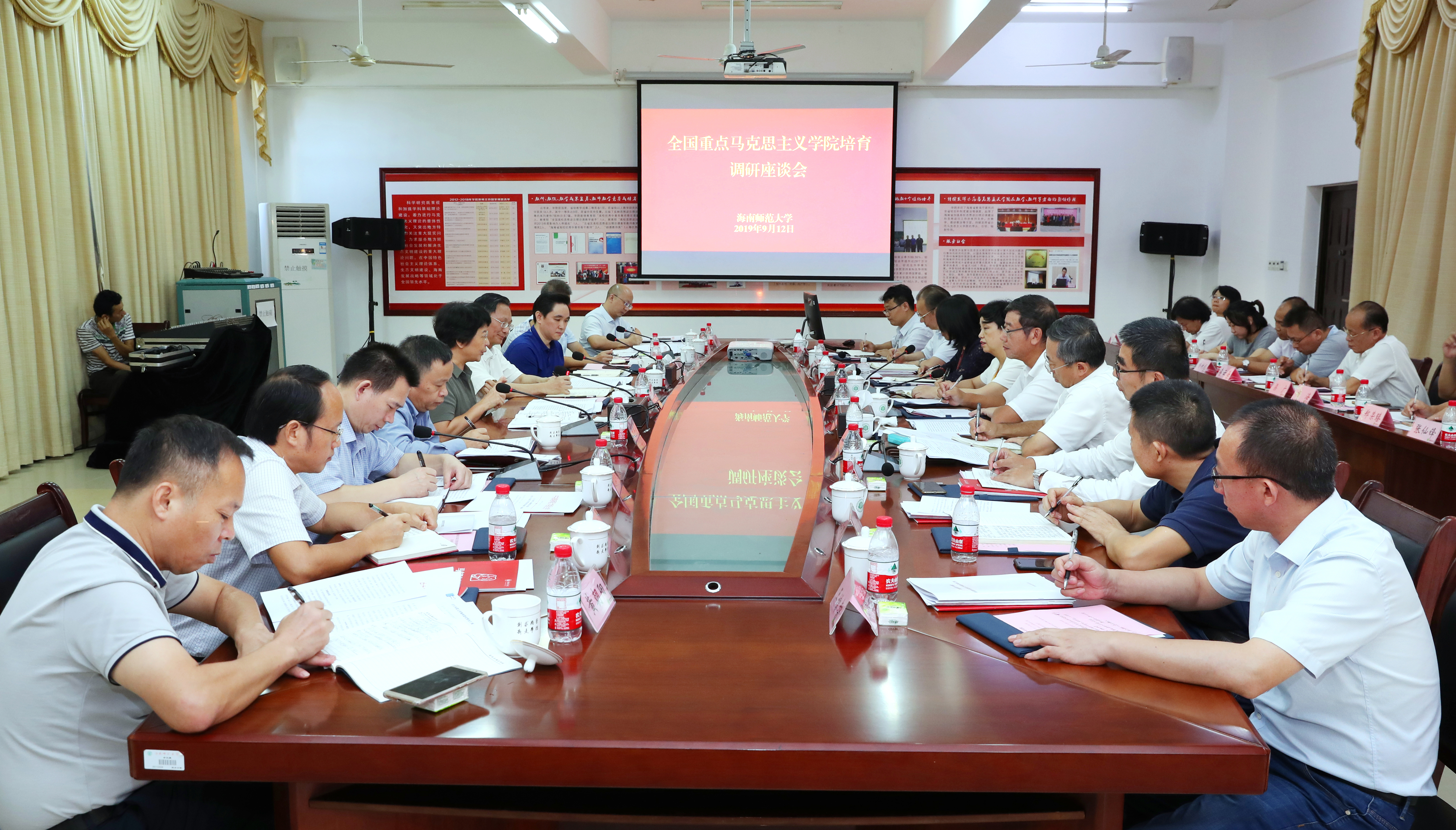 宣传部常务副部长、省电影局局长、海南省人大常委会委员符宣国,省社科联主席钟业昌,省教育厅专职副书记吕治国,省委宣传部、省教育厅、省社科联相关处室负责人参加调研。我校党委书记李红梅,校党委副书记、校长林强,校党委副书记刁晓平,副校长史海涛、李森,校党委委员、宣传统战部部长黄培怡陪同调研,马克思主义学院、相关职能部门负责人、马克思主义学院专家组成员参加座谈会。