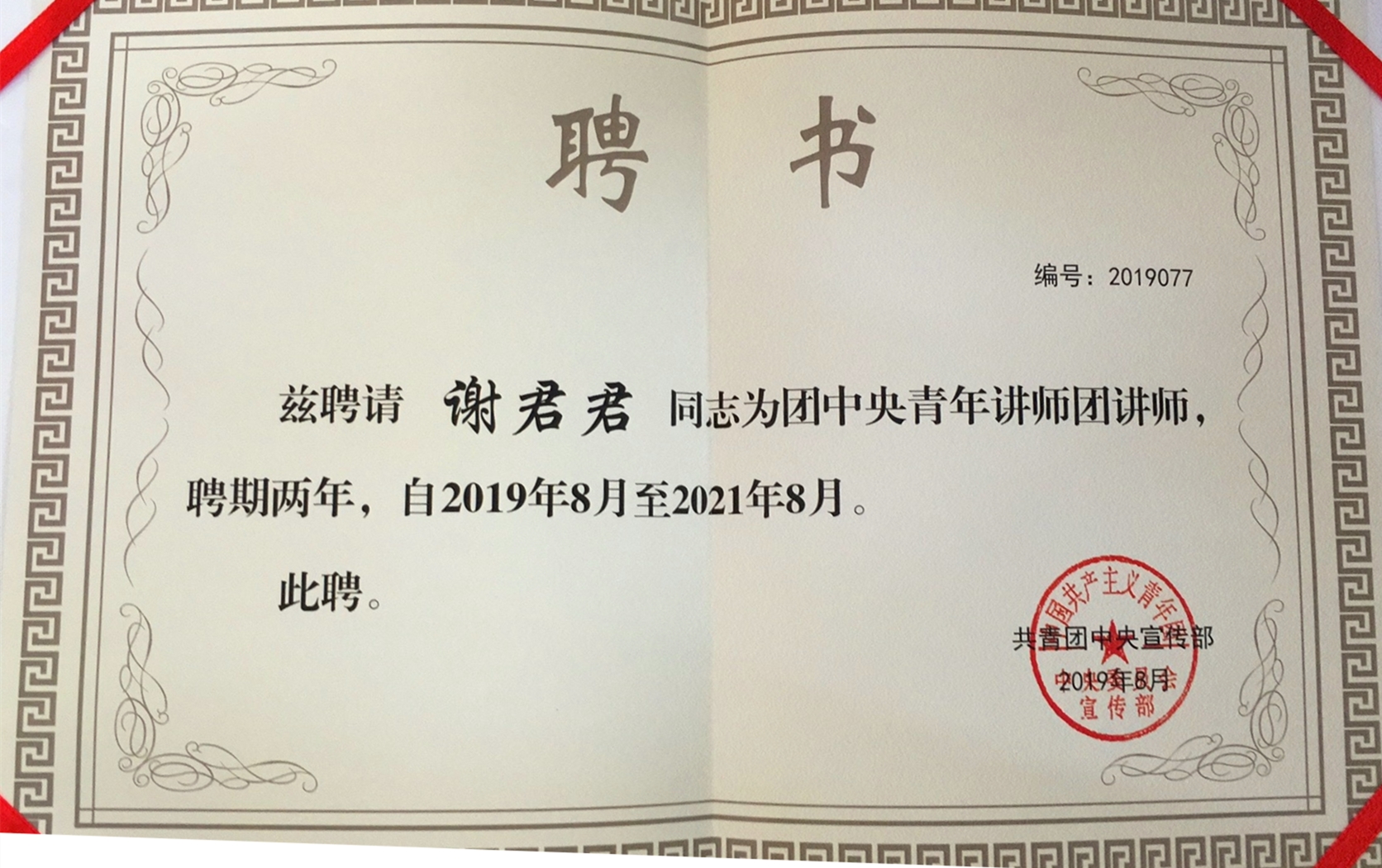 2019年7月,由共青团中央举办的“青年讲师团”培训班在中央团校举行,来自全国各地区各系统的150名优秀青年党政干部、团干部、高校青年教师、青年理论专家、青年媒体工作者、青年典型参加培训。经过层层遴选,仅有60名优秀青年讲师最终成为“团中央青年讲师团”正式成员。我校马克思主义学院副教授谢君君老师受此殊荣。