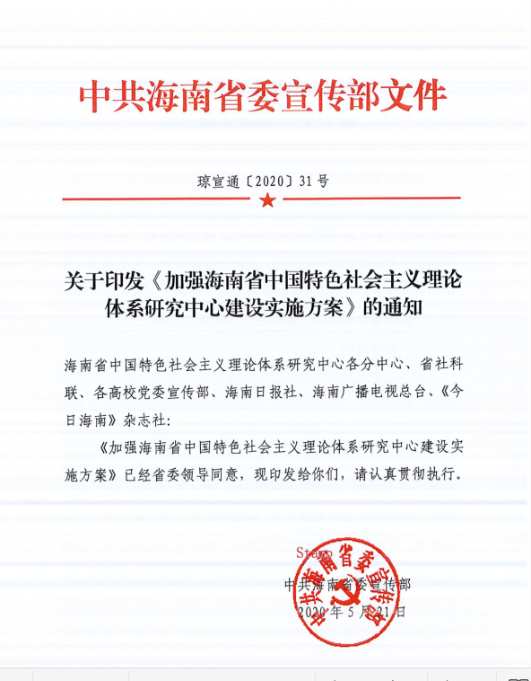 琼宣通[2020]31号关于印发《加强海南省中国特色社会主义理论体系研究中心建