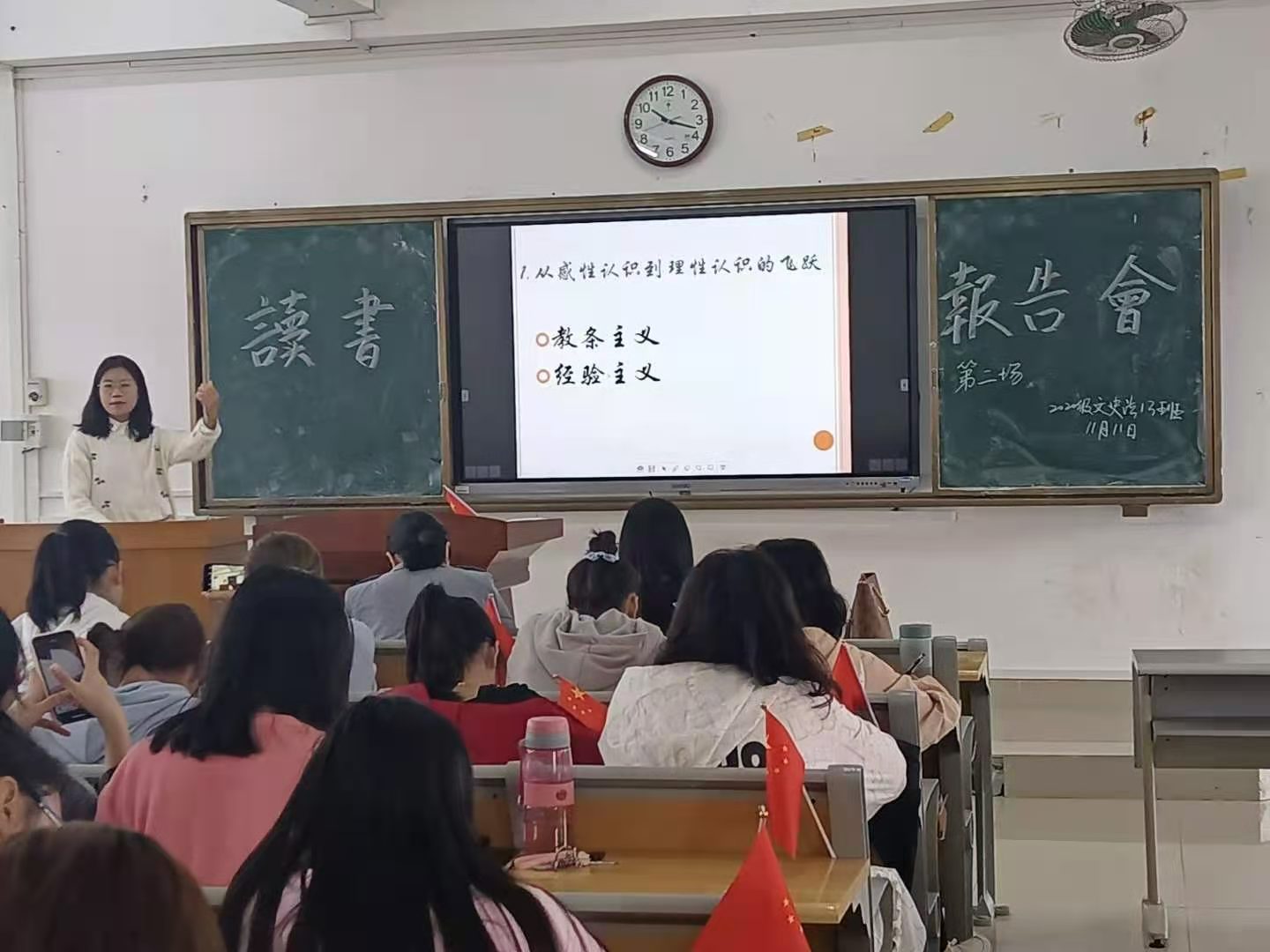通过本次读书报告会,同学们对《实践论》和《关于费尔巴哈的提纲》有了更深刻的认识,对思维的真理性认识也更加客观;明确了离开实践的认知,往往是表面的、片面的。同时也深刻地认识到,在授课时,更多的是需要与同学们交流、探讨、沟通与互动,在大学课堂里只有通过不断地探讨才会更加深刻地认识到某一问题,也才会使我们更加接近真理!希望同学们能够珍惜站在讲台上的机会,不断提升自我,勇攀高峰!
