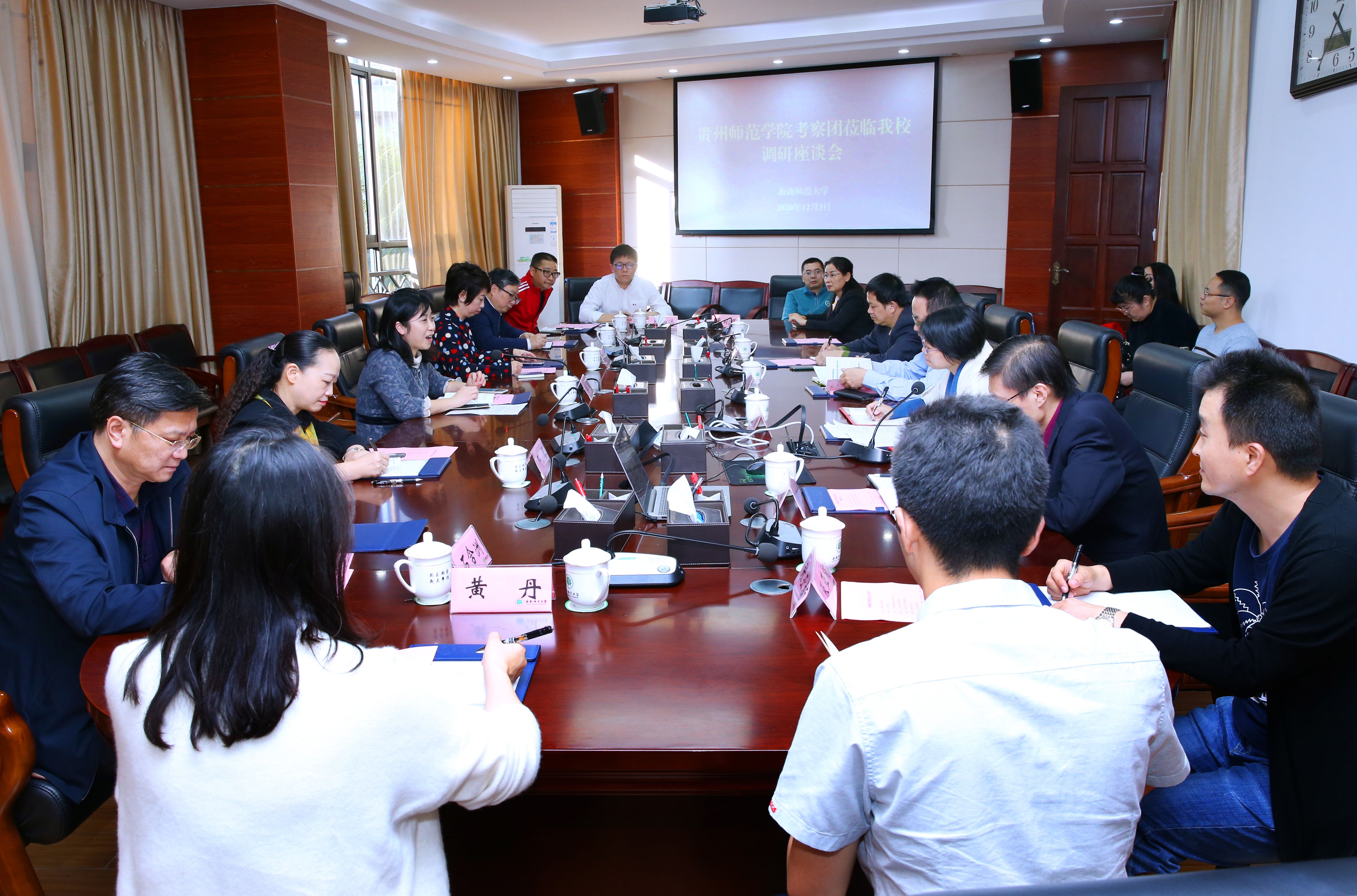 2020年12月3日下午,贵州师范学院王茜等一行8人莅临我校进行调研。学校学生工作处处长杨海、研究生工作部党委书记郑荣臻、教务处副处长孙自强、马院基础教研室主任陈连珠、马院思政系主任董前程、原理教研室主任王巍巍、纲要教研室主任王睿、人事处教师工作科科长符桑岚、美术学院学工办主任张亚楠等出席并参与座谈。会议由马克思主义学院党委主要负责人兰岚主持。