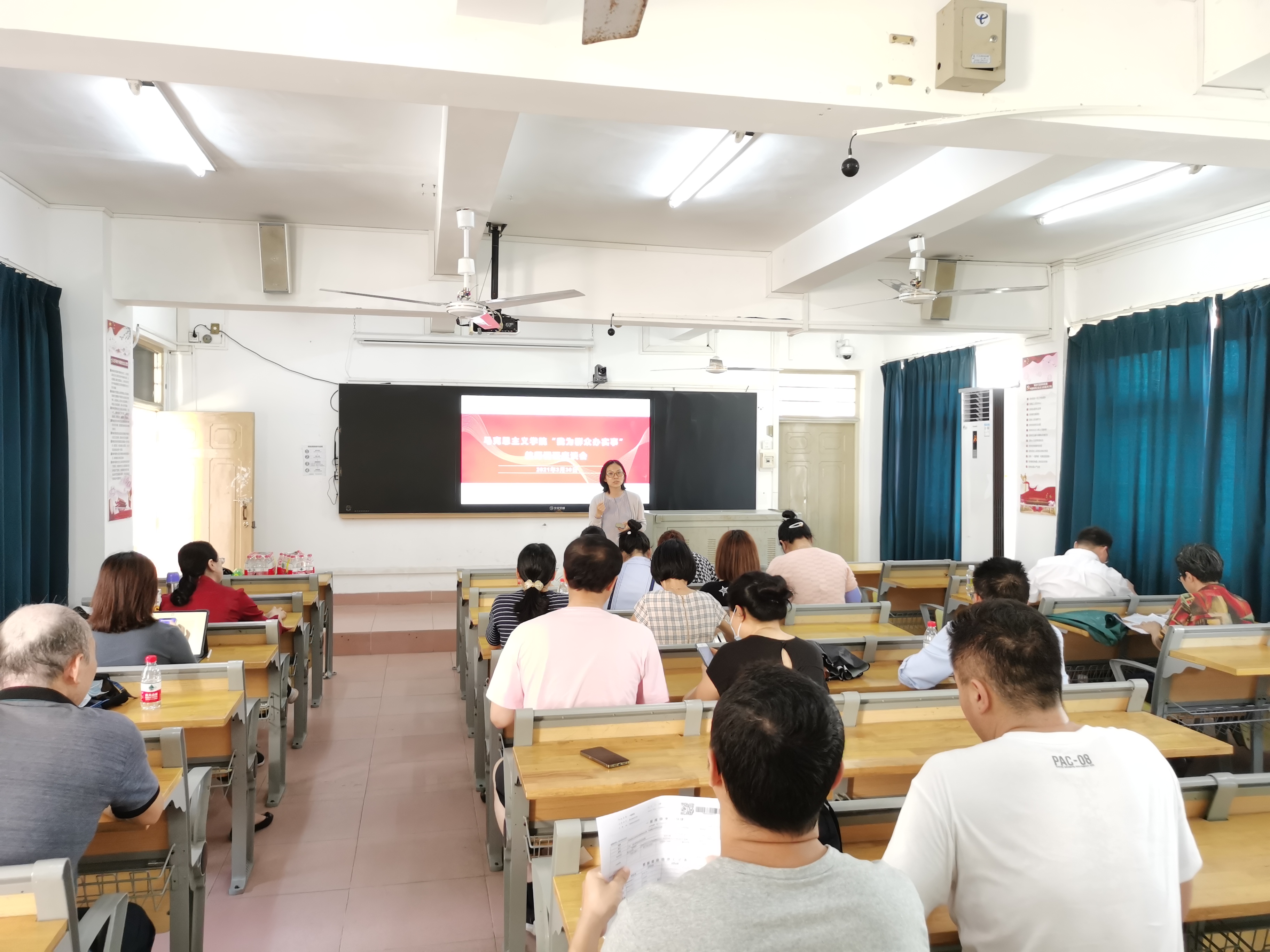 为深入贯彻落实《海南师范大学党史学习教育实施方案》《中共海南省教育厅委员会关于印发&lt海南省教育系统党史学习教育实施方案&gt的通知》,切实推动“我为群众办实事”实践活动落地见效,3月30日15:00,马克思主义学院在田家炳书院501召开“我为群众办实事”教职工座谈会。20名教职工代表参会。