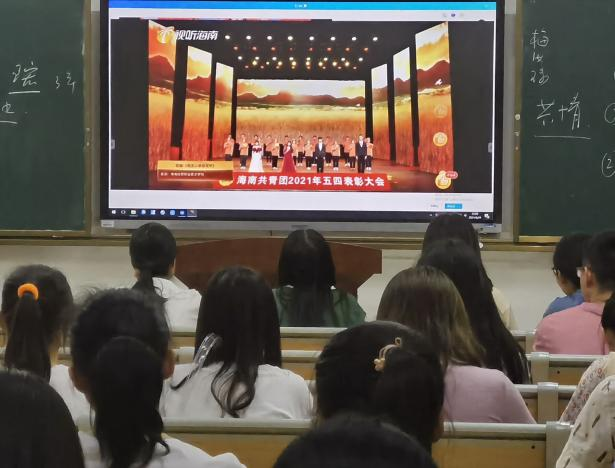 同时,为纪念五四运动100周年,展现学院青年健康向上的精神风貌,增强学生的爱国热情和集体荣誉感,弘扬“五四精神”。马克思主义学院组织学生干部观看了由共青团海南省委主办的“学党史、强信念、跟党走”海南共青团2021年“五四”表彰大会。通过观看本次“五四”表彰大会,让学生干部了解了我们身边的先进青年集体和个人,了解到他们的优秀事迹,更加清楚自己身上肩负的使命和责任,引导学生干部不忘初心跟党走,牢记历史使命,让“五四”精神生生不息,不断传承,发展。
