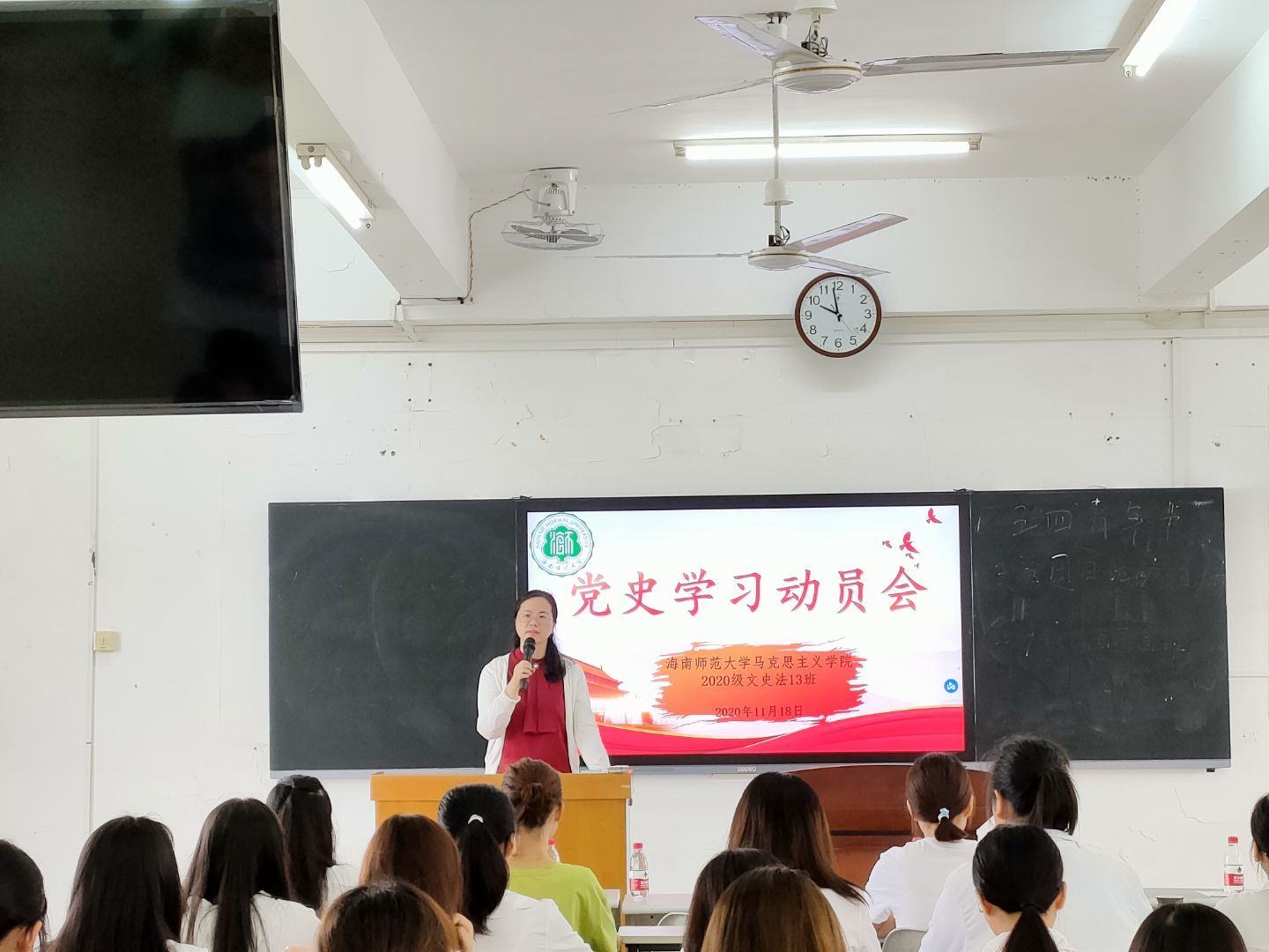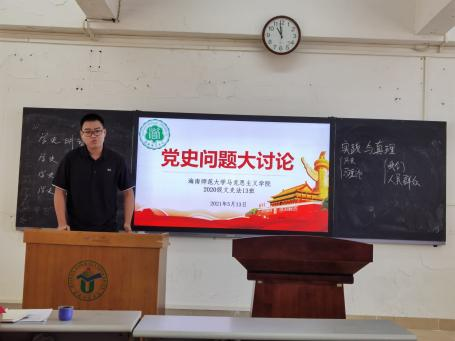 2020年11月18日,王云华老师开展了党史学习动员大会,号召大家开始进行党史方面的学习,向同学们提出对党史学习教育的基本要求,并于寒假前夕,鼓励大家通过自主阅读“四史”书目,观看《毛泽东》电视剧等方式学习党史知识。2021年3月11日,以“学史明理、学史增信、学史崇德、学史力行”为主题的党史读书报告会正式拉开序幕,其中共分为八组四场举办,另外还举办了两场有关党史问题的主题班会。期间有幸邀请到程掀、向广宇、李哲漫、霍知节、李岩、高昕等6位老师作为评委嘉宾出席报告会,读书报告会多采取授课式研讨会、互动式研讨会、主讲人汇报和模拟讨论课堂的多种形式进行。八个小组分别根据不同主题进行了学习与汇报。4月4日清明节,王老师带领同学们前往海南省海口市琼山区琼崖红军云龙改编旧址和冯白驹故居,追思英雄,缅怀先烈,瞻仰祭扫。“清明祭英烈”主题教育活动让青年学子们感受到了在腥风血雨的年代,英烈们为保卫山河抛洒热血,献出宝贵生命的崇高革命精神。4月8日,组织同学们开展了一场“批评与自我批评”的主题班会,深入学习我国党史上延安整风运动及其在同学们中开展了深入的批评与自我批评。5月13日,该班组织了一场党史问题的大讨论,在这次大讨论中同学们提出自己在阅读党史中遇到的疑惑点并阐述自己的观点,王老师对同学们的问题进行了学理的解答,使大家对党史有了进一步深刻的了解。6月4日,班级组织了线下的党史知识竞赛,大家答题迅速,正确率较高,同学们的学习积极性较高。