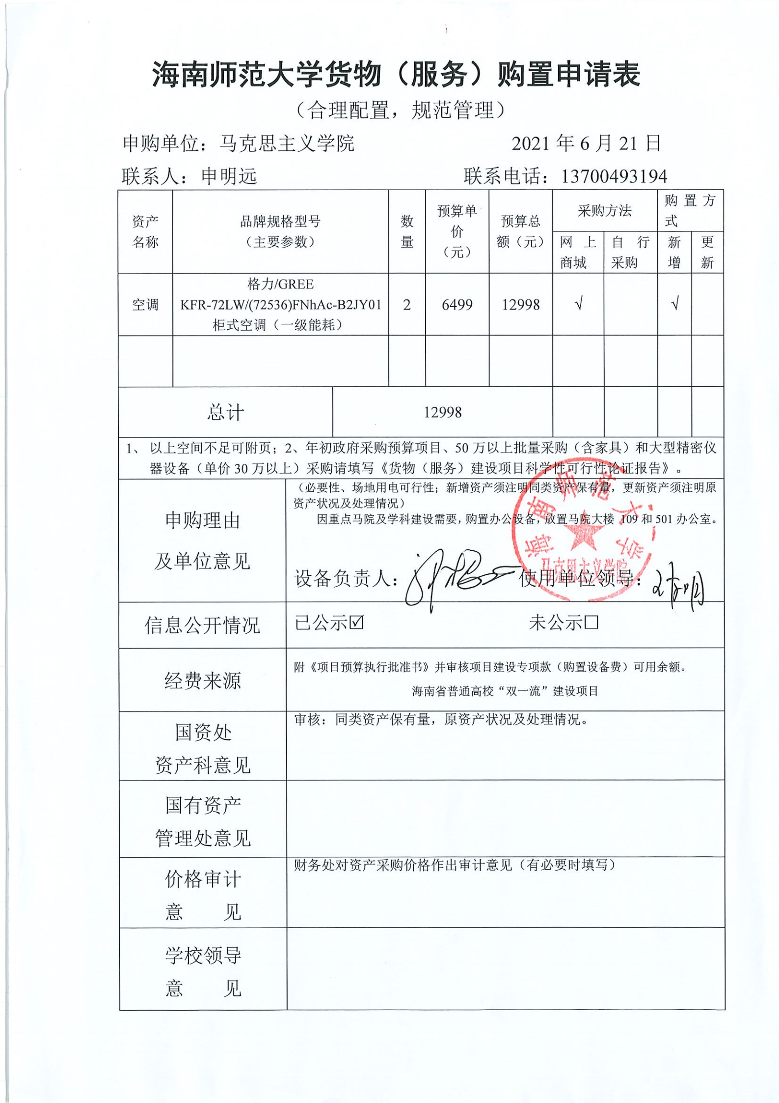 因重点马院、学科建设需要,现需要采购空调2台,放置马院新大楼109、501,经费从海南省普通高校“双一流”建设项目支出。