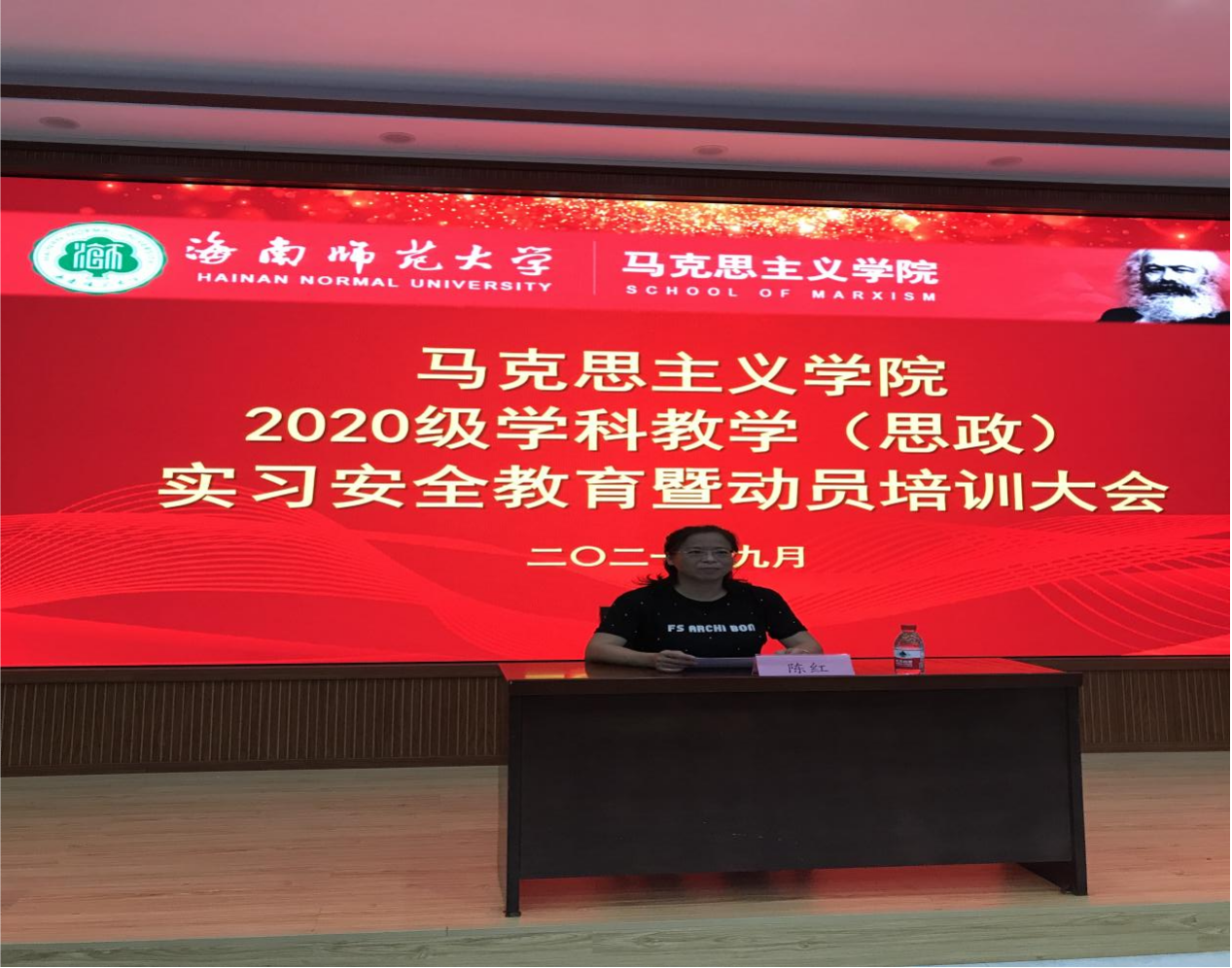 2021年9月16日下午2点30分,马克思主义学院在马院大楼201报告厅举办了2020级学科教学(思政)实习安全教育暨动员培训大会,马克思主义学院陈红副院长、知名校友海南中学高级政治教师叶小婙以及2020级学科教学(思政)全体同学参与了这次活动。