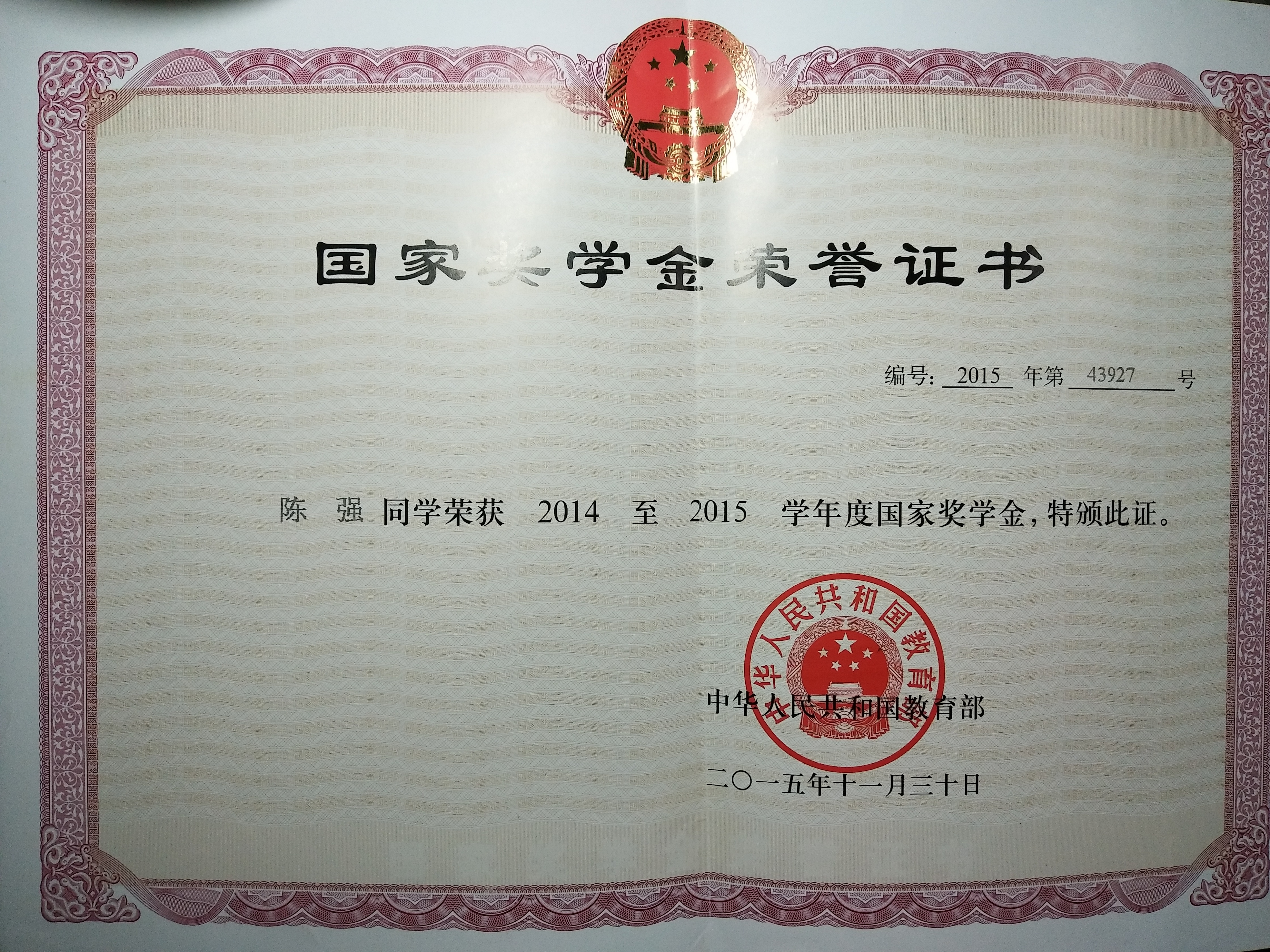 1、曾获2014—2015学年度国家奖学金;