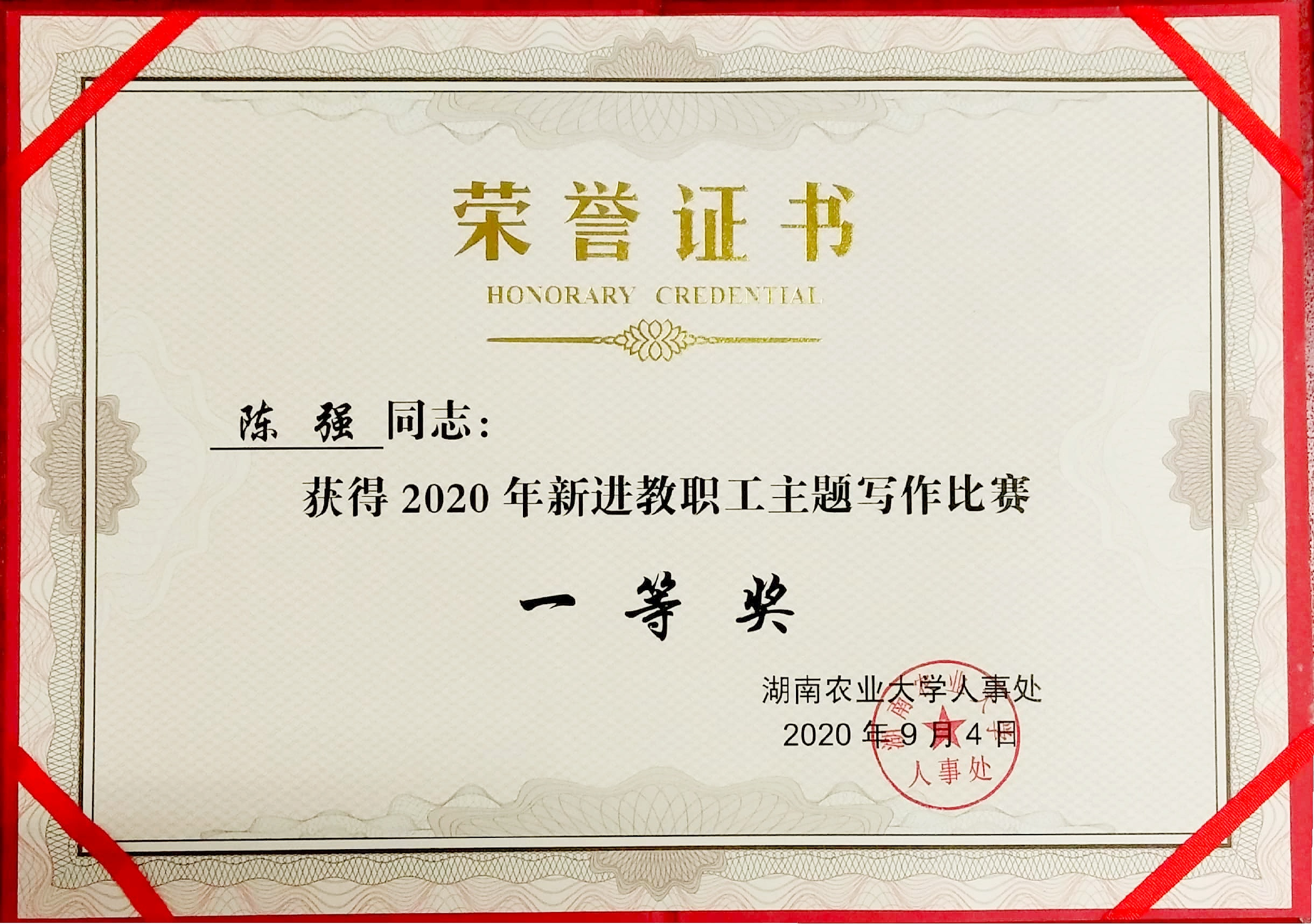2、2020年获得湖南农业大学新进教职工“写作比赛一等奖”;