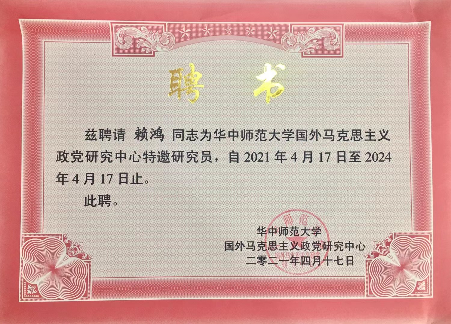 ·2021年被华中师范大学国外马克思主义政党研究中心聘为特邀研究员