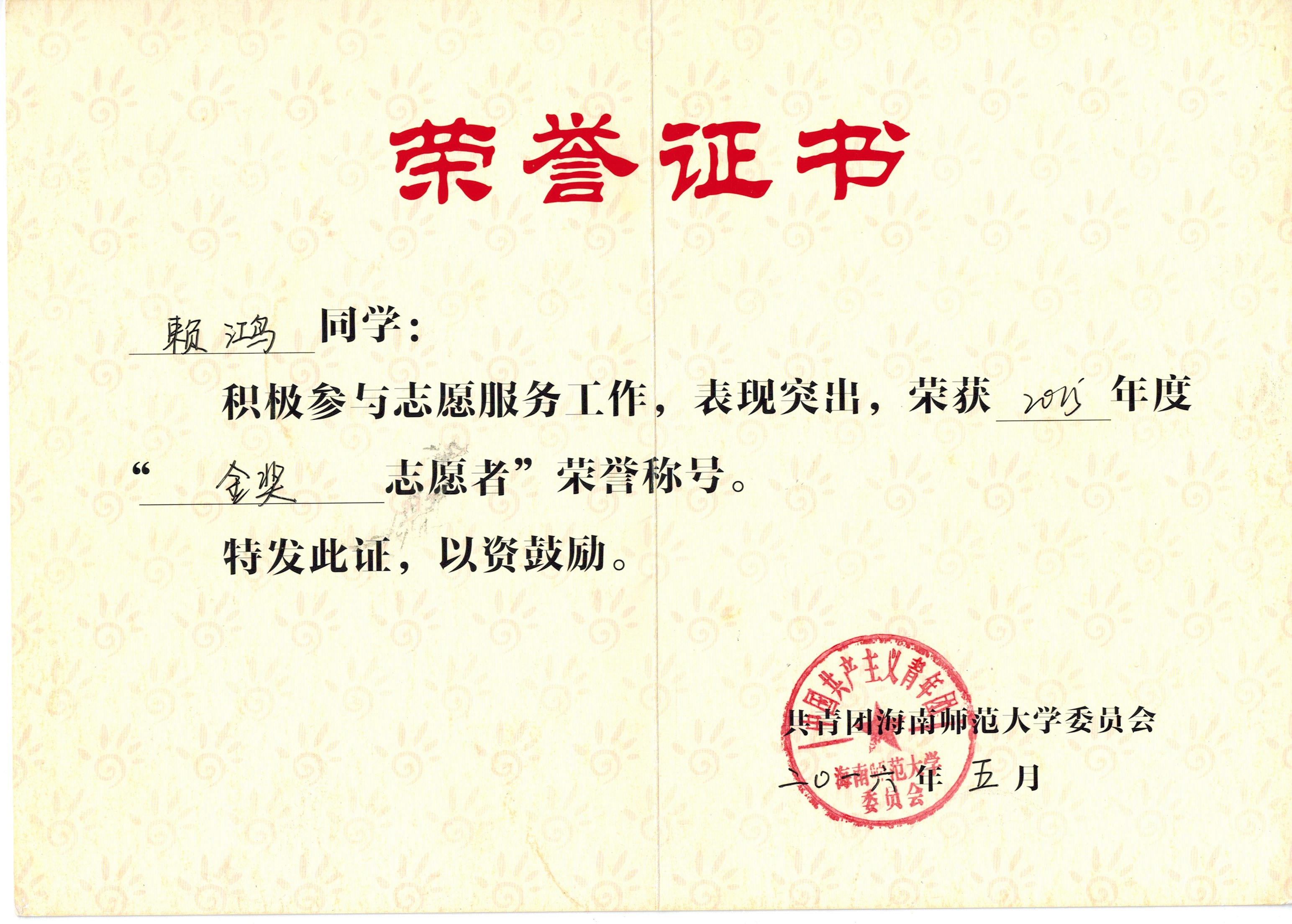 ·2016年荣获海南师范大学“2015年度金奖志愿者”称号