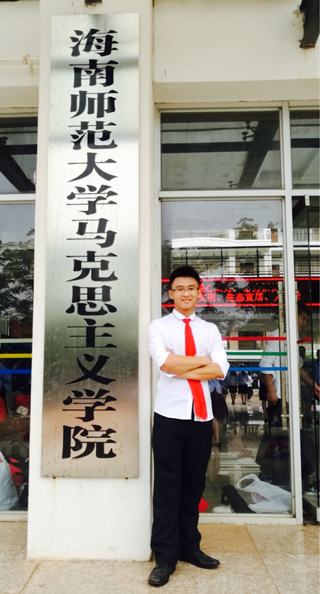 2013年9月,我独自拖着沉重的行李箱,坐着从未见过的轮渡,来到了位于南海之滨的海南师范大学政法学院(后改为马克思主义学院)报道。报道那天大雨倾盆,但李哲漫老师带着学生干部们不辞辛苦的为我们撑伞避雨、办理手续、扛运行李…从入学的第一天起,就感受到了学院老师们和学长学姐对我们的关爱与支持。在老师们的鼓励与支持下,报名参加了团委学生会、担任班级干部,积极参加学院学校的各类活动,从大一到大四我历经了学生会的干事、部长、主席和学院的兼职辅导员,这些充实的经历不仅没有影响学习,大学本科成绩一直稳居专业前列,并顺利通过了教师资格考试、大学英语四六级、计算机二级等证件考试,而且还锻炼了自身的领导、组织、协调、交往等各方面的能力,我也从一个胆小怕事逐渐向乐观自信转变。四年的本科学习生涯忘不了李哲漫老师、陈霆老师、谢丹老师、言玉梅老师、吴芳老师、张现洪老师、江海全老师等人在工作生活上的栽培爱护和学习上的谆谆教诲,忘不了诸多挚友和同学的支持与帮助,正是有马院这么一批严谨严格、真诚真心的师生朋友们,才使我在海师求学期间收获满满,同时也为我今后的学习生涯筑牢了基石。