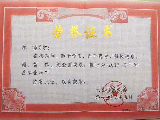 ·2017年荣获海南师范大学“2017届优秀毕业生”称号