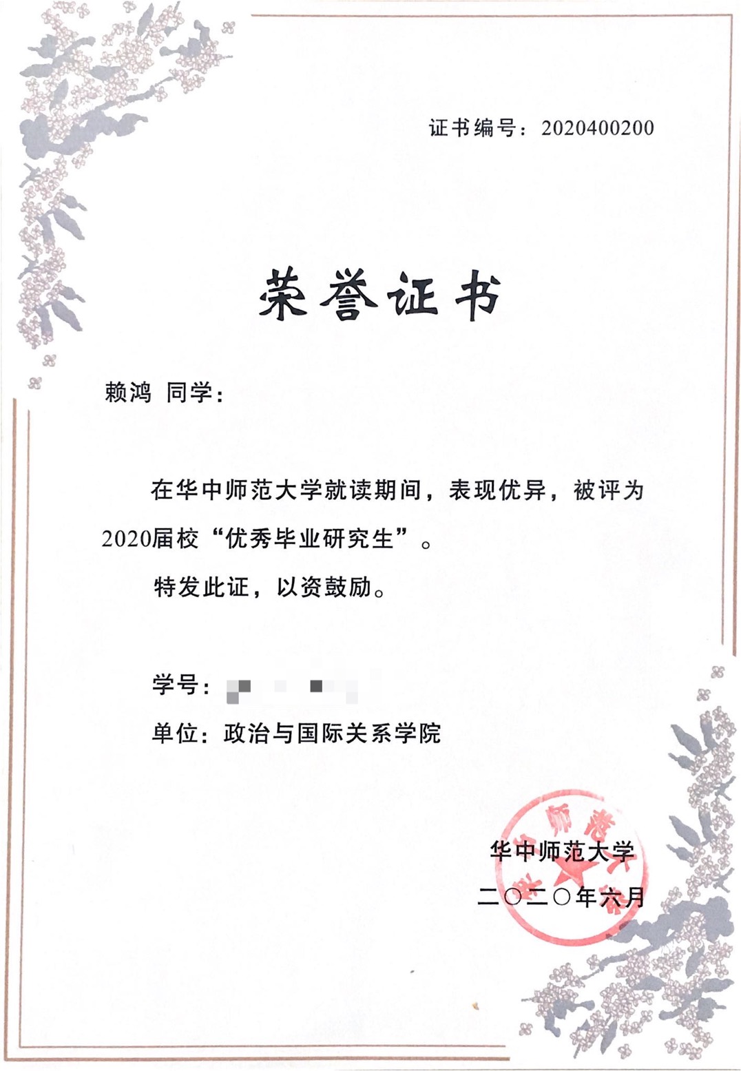 ·2020年荣获华中师范大学“2020届优秀毕业生”
