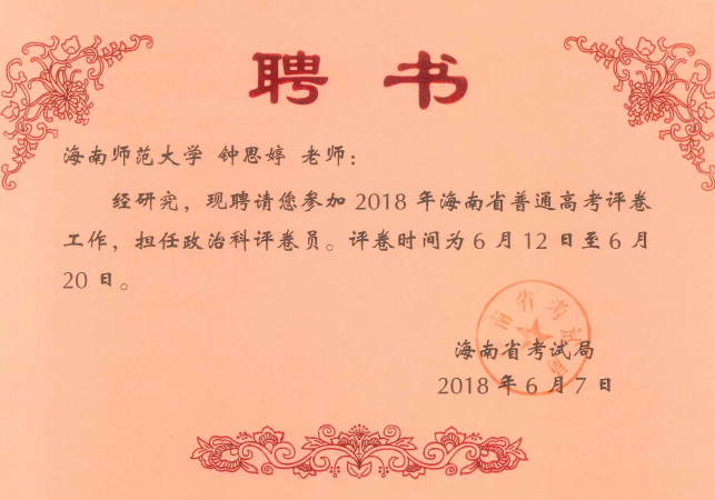 兴趣是最好的老师。高三报志愿的时候,我全部填报的都是师范类院校。说实话,我当时没有那么崇高的思想觉悟,我只是单纯的喜欢寒暑假。但是团委学生会的组织下,从本科到研究生期间,我参加了4次“三下乡”活动,从海南到青海,在“三下乡”活动中,我的心灵受到了震撼,我看到了那些求知若渴的孩子们,我才切身明白了一名教师身上的责任,同时更加坚定了我要走这一条任重而道远的道路。研究生期间,我积极报名参加了全省高考改卷,希望能够积累经验,帮助更多的学生。我被评为优秀阅卷教师,了解出题意图及规律,答题技巧,总体而言,收获满满。