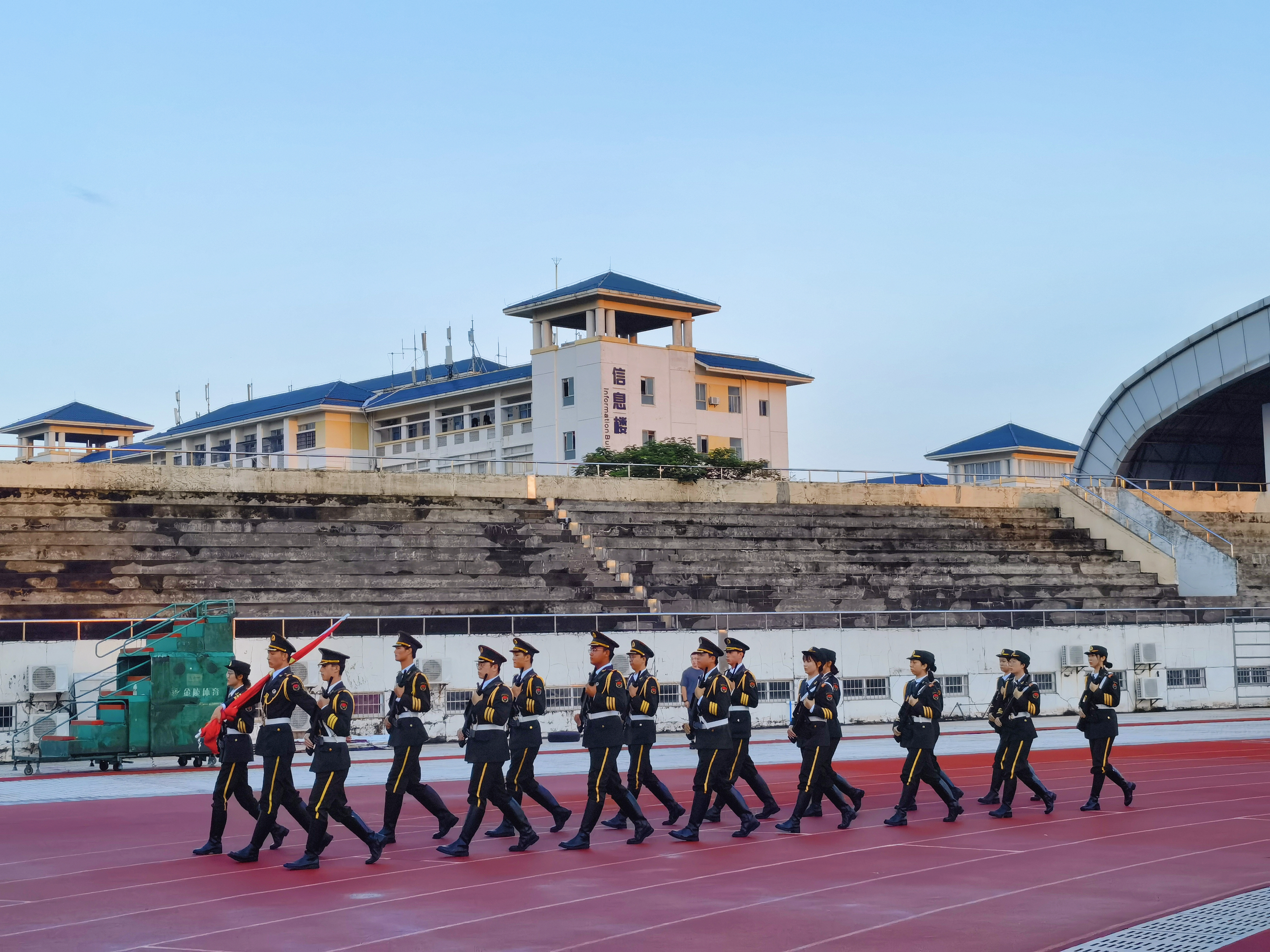伴随着庄严的国歌,鲜艳的五星红旗徐徐展开,在全体师生的注目中,迎着初升的太阳,在晨曦中迎风飘扬。