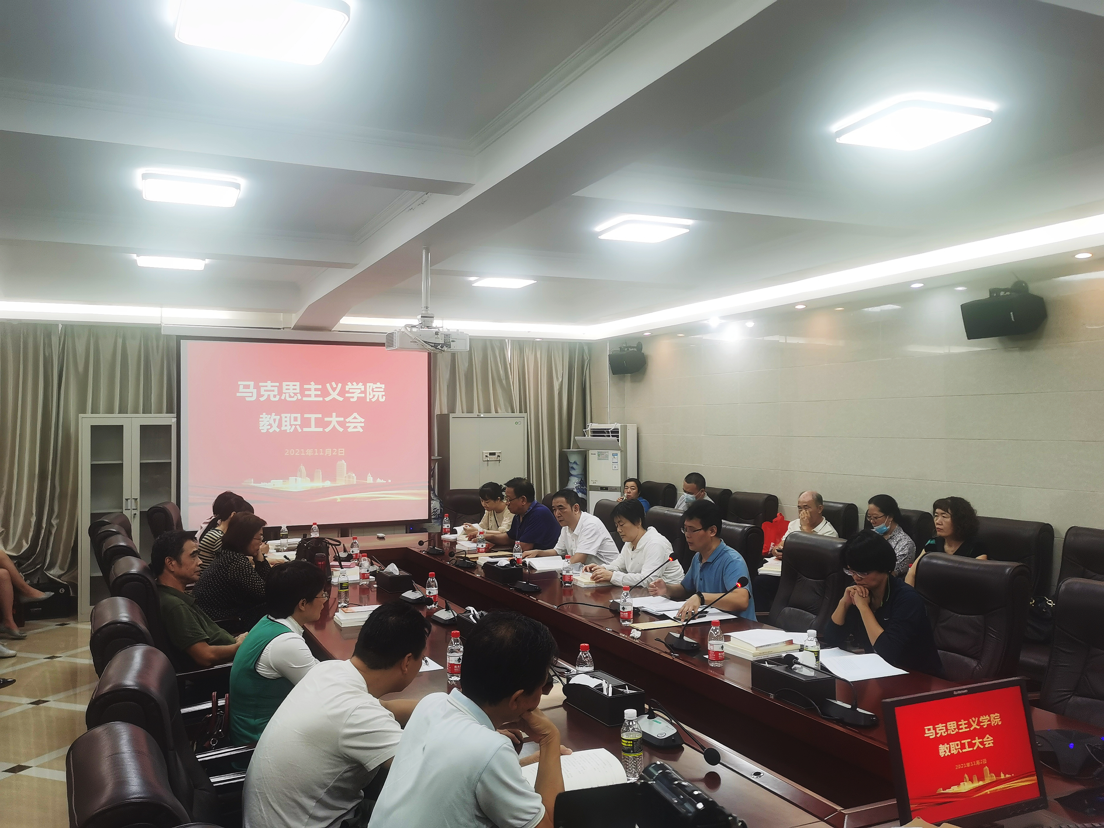 2021年11月2日15:00分,马克思主义学院在第一办公楼一楼会议室召开了学院教职工大会,学院行政负责人王友明,党委书记兰岚,副院长杨英姿、丁匡一及全体教师参会,会议由王友明主持。
