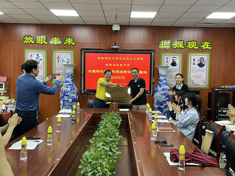 为贯彻党的教育方针政策,落实中共中央关于加强新时代马克思主义学院建设的相关文件精神,全面加强世情国情省情和爱国主义教育,宣传海南发展建设的丰硕成果,促进海南师范大学马克思主义学院人才培养工作和海南省农垦中学事业的共同发展,经双方协商,达成共同建设“海南师范大学研究生学科思政校外教学实践基地”的共识。