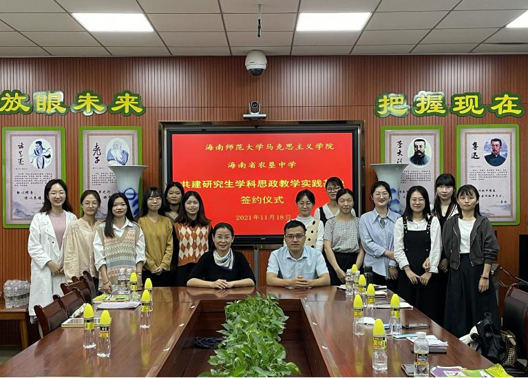 2021年11月18日,海南师范大学马克思主义学院丁匡一副院长带队,陈连珠教授,许袖飞老师与2020级学科(思政)研究生赴海南省农垦中学参加研究生学科思政校外教学实践基地签约仪式。