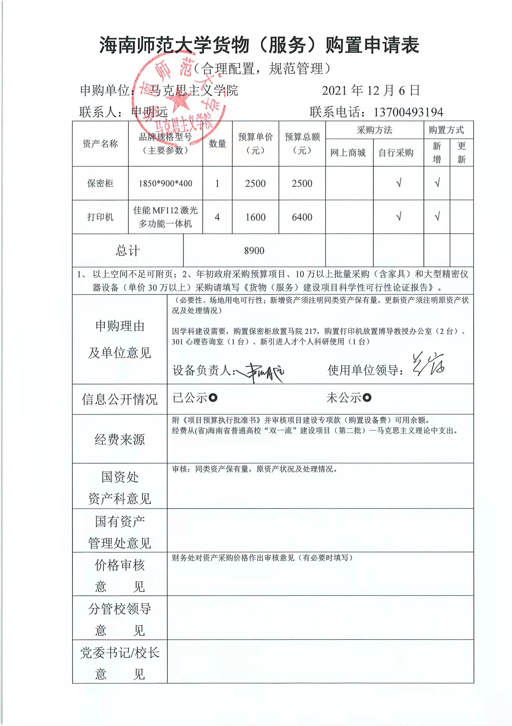 马克思主义学院因学科建设需要,购置保密柜1个,多功能打印机,按照学校固定资产采购要求,现予以信息公开。