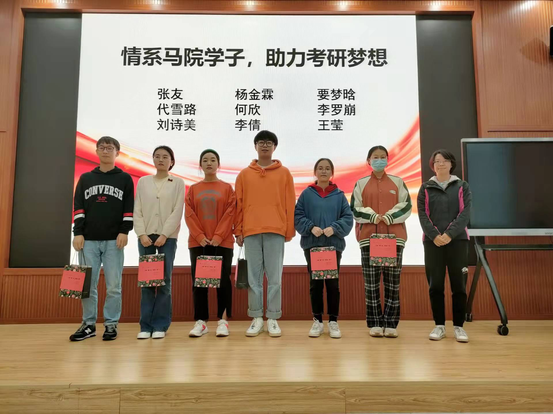 慰问会总共分为两个环节,第一个环节是由兰岚书记和李哲漫老师为考研学子分发学院为其精心准备的考研加油包。考研加油包寓意深刻。内有:文具,代表着战斗的武器,在考场上任意驰骋;橙子和苹果,代表着能量,预祝马到“橙”功,考研必“果”;2021级的大一新生亲手写的信件,代表着对考研学子深深的祝福。让考研学子带着祝福奔赴考场,由此也体现出不同年级同学之间互帮互助的考研氛围。