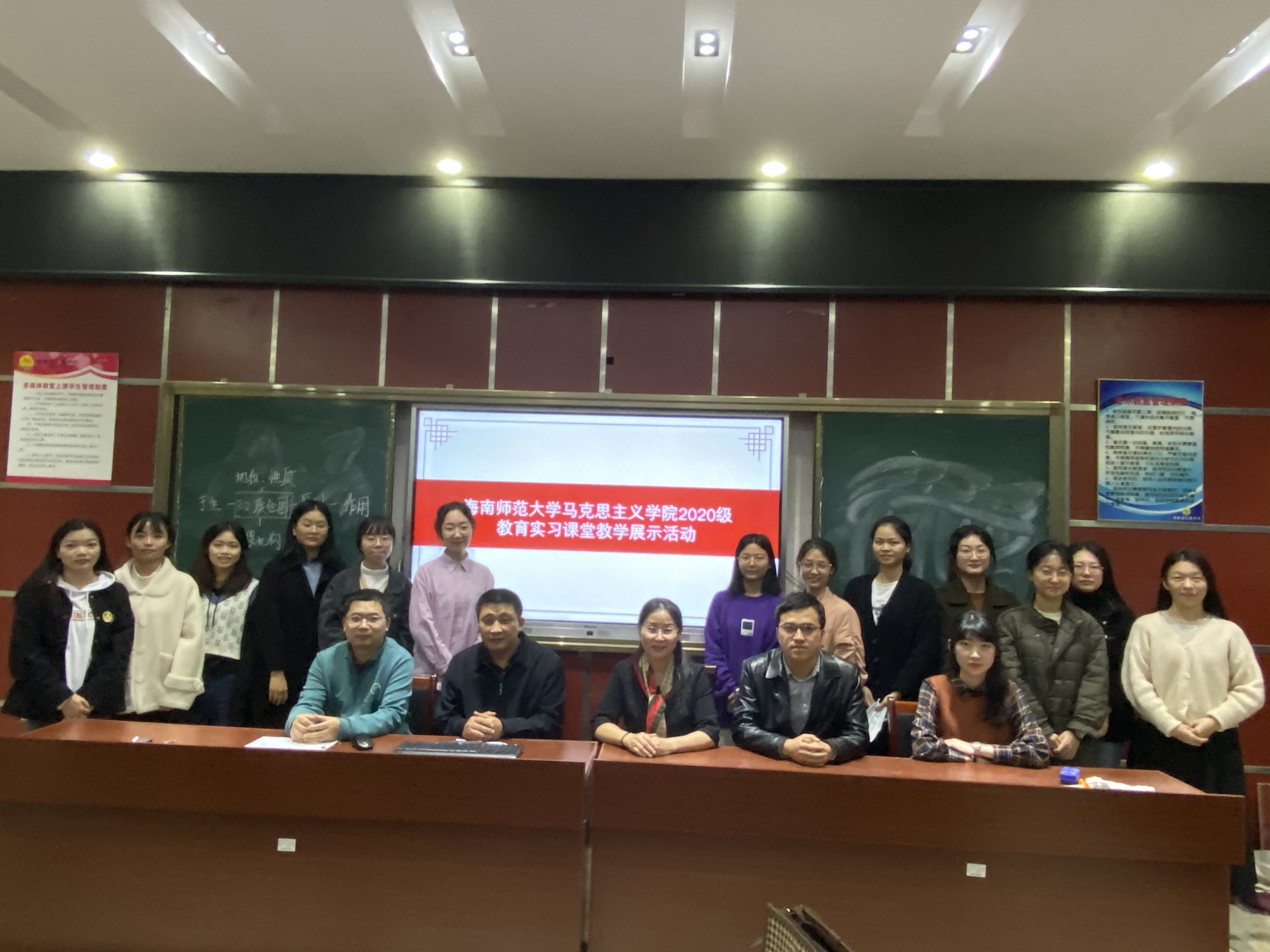 为了检测2020级学科教学(思政)专业研究生的课堂实习成果和反思专业硕士培养质量,海南师范大学马克思主义学院专硕培养小组于2021年12月29号下午,在海南省农垦中学举行了2020级教育实习课堂教学展示活动,参加本次活动的学生有20级学科教学(思政)全体研究生及21级学科教学(思政)部分研究生,出席本次活动的专硕培养小组成员有研究生院刘湘平副院长、马院陈连珠教授、董前程副教授、许袖飞老师以及海南省农垦中学政治组组长冯彦安老师,刘小安老师。