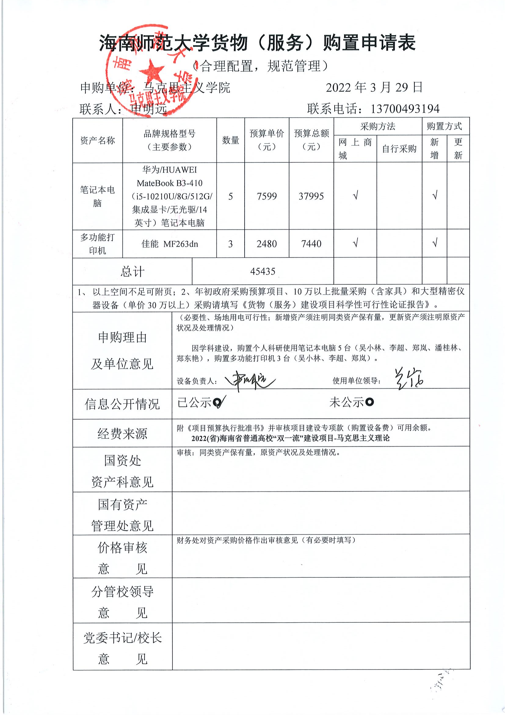 因马克思主义学科建设需要,购置笔记本电脑5台、多功能打印机3台。按照学校固定资产采购要求,现予以信息公开。