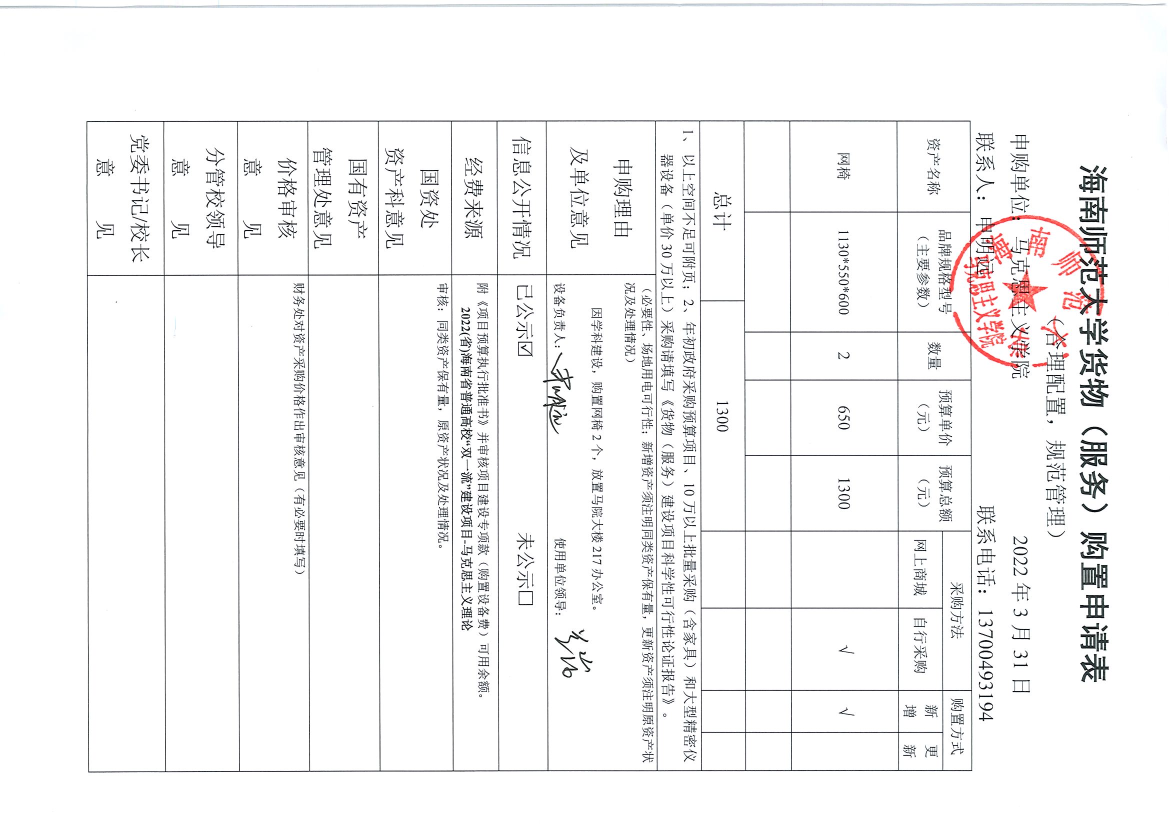 因马克思主义学科建设需要,购置网椅2张。按照学校固定资产采购要求,现予以信息公开。
