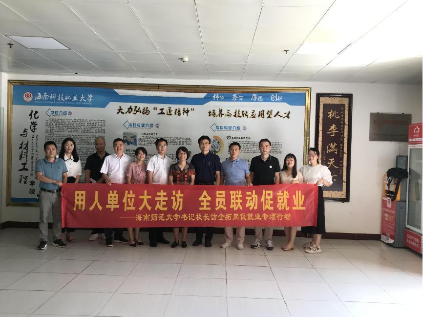为贯彻落实党中央、国务院关于高校毕业生就业工作的决策和开拓更多就业岗位,解决我院毕业生就业问题,5月27日上午,学校党委副书记刁晓平带领督查督导办公室副主任郑骁鹏、我院书记兰岚、副院长丁匡一、辅导员李哲漫和喻兴琼到海南科技职业大学开展书记校长访企拓岗专项行动。海南科技职业大学党委书记文强、执行校长郑兵,副校长李国章、人事处处长吴贺男、马院院长李乐营、执行院长何世卓、教学副院长陈春柳等陪同考察并参加座谈会。
