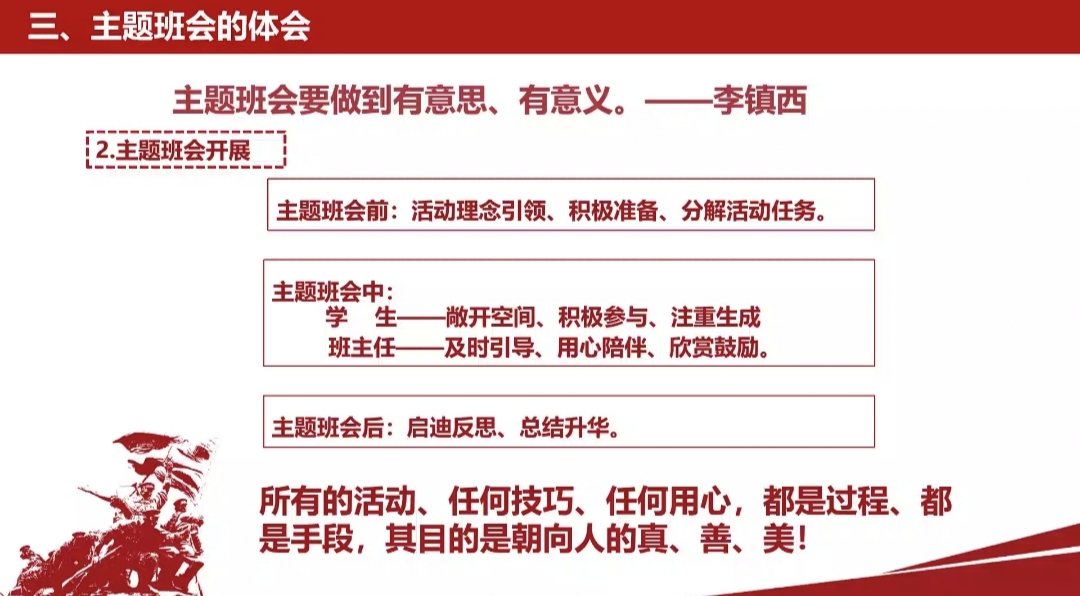 在此次讲座中,琼海市职业中等专业学校的张丽丽老师首先为同学们详细地讲述了主题班会的价值定位,她强调主题班会的功能主要是德育功能。其次,张丽丽老师从方案设计、活动准备、组织实施、总结反思四个方面,为我们展示了班主任应如何有效的开展一个主题班会。最后,张丽丽老师提到了主题班会的体会,她强调所有的活动、任何技巧、任何用心,都是过程、都是手段,其目的是朝向人的真、善、美。